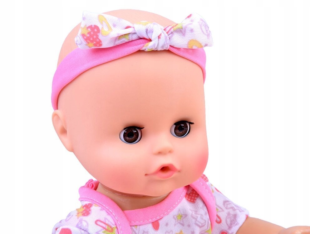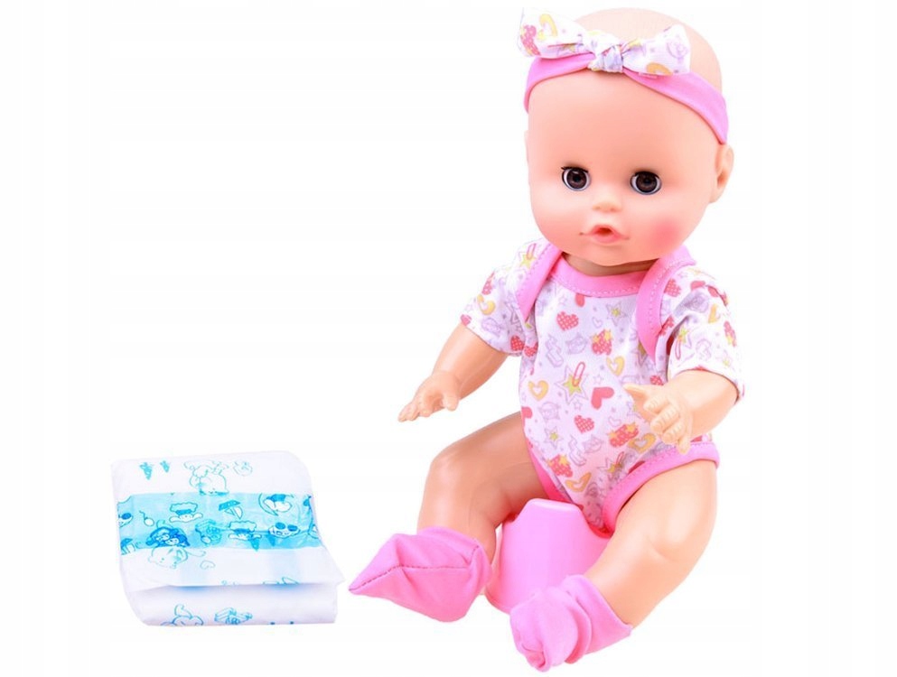 Лялька одягнена в боді, пов'язку та носочки. Ви можете загорнути її в ковдру і одягнути нагрудник під час годування. У комплект також входять підгузник і горщик для ляльки.