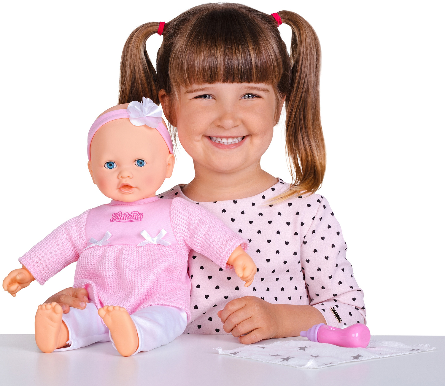 Малюк одягнений у красиву, ретельно зшиту рожеву кофтинку та білі шорти. На голові у неї сіра пов'язка з рожевою квіткою. Також у Наталі є солодка подушечка у формі зірочки, пелюшка у формі зірочки та пляшечка для годування. Чарівне личко ляльки викличе у дитини бажання пограти з улюбленою іграшкою