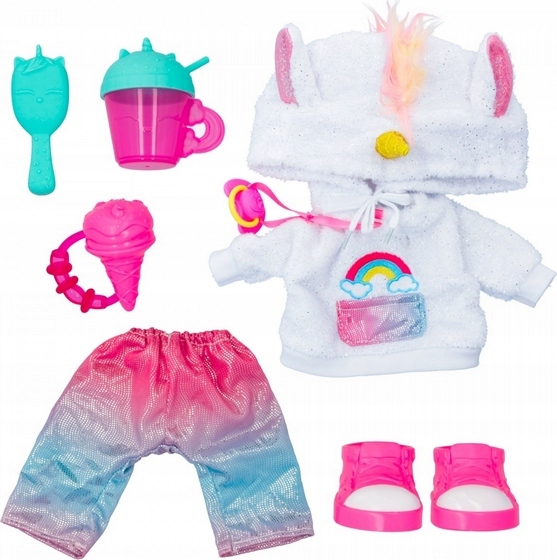 - Набір включає : лялька, модне вбрання, взуття в тон , брязкальце у формі ріжка, дитяча пляшечка, соска, гребінець для волосся