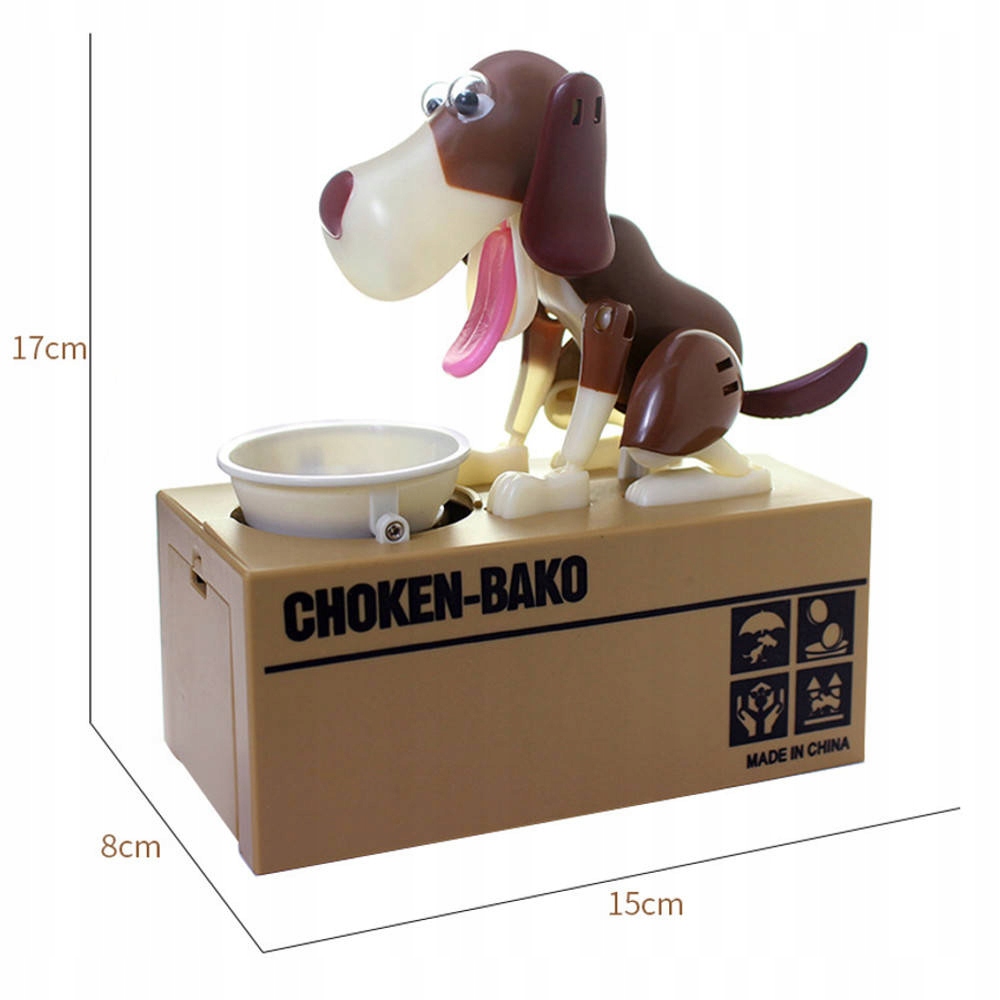 Ми кидаємо монету в миску собаки, яка знаходиться перед ним, потім при дотику собака починає рухатися, ніби їсть їжу з миски, в результаті чого монета потрапляє в скарбничку. Поїдаючи гроші, собака кумедно рухається і ляскає вухами. Для роботи скарбнички потрібні 3 батарейки.