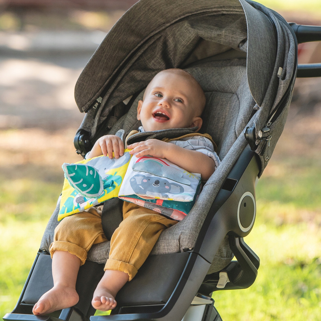 - Тримання сторінок з м’якої тканини та різних текстур допомагає стимулювати відчуття вашої дитини та розвивати її моторику.