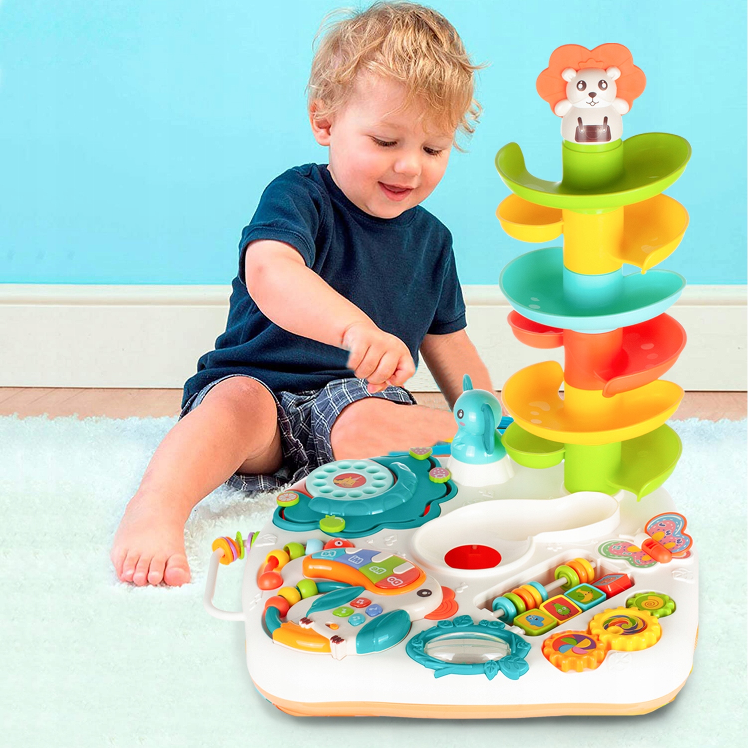 Інтерактивний стіл з безліччю рухомих елементівідеально розвиває і вдосконалює мануальні та моторні навички дитини.Стіл складається з приємних оку пастельних кольорів і світяться та ігрових елементів розвиватиме зір і слух дитини.