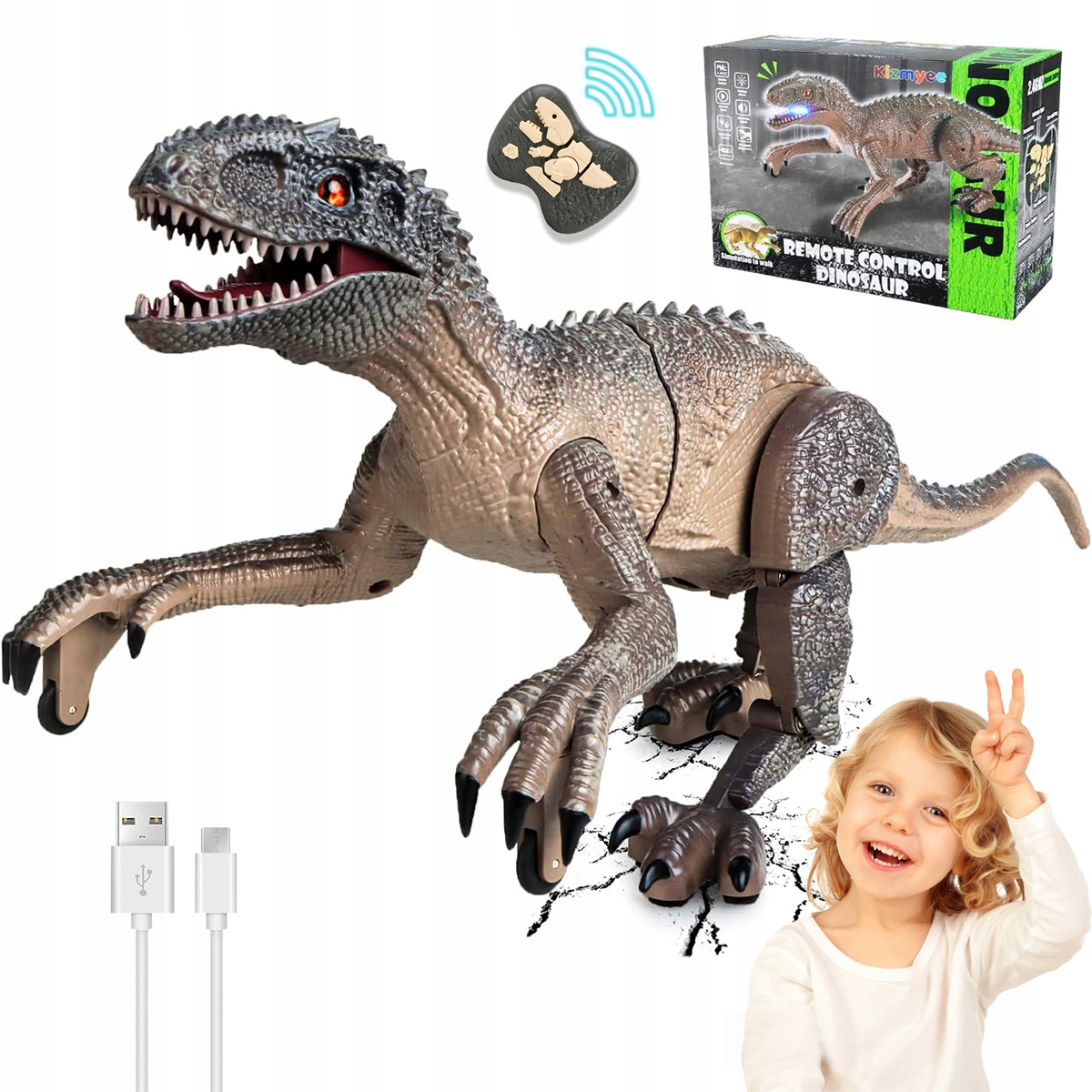 Унікальний пульт дистанційного керування у формі копалин спрощує керування. Іграшка Динозавр може ходити вперед/назад, повертатися вправо/вліво і одночасно видавати звуки. Після натискання кнопки «One Click Demo» дистанційно керований динозавр виконує певні рухи. Це ніби справжній велоцираптор, який крокує перед вами. Дозвольте вашій дитині відчути пригоду Юрського періоду!