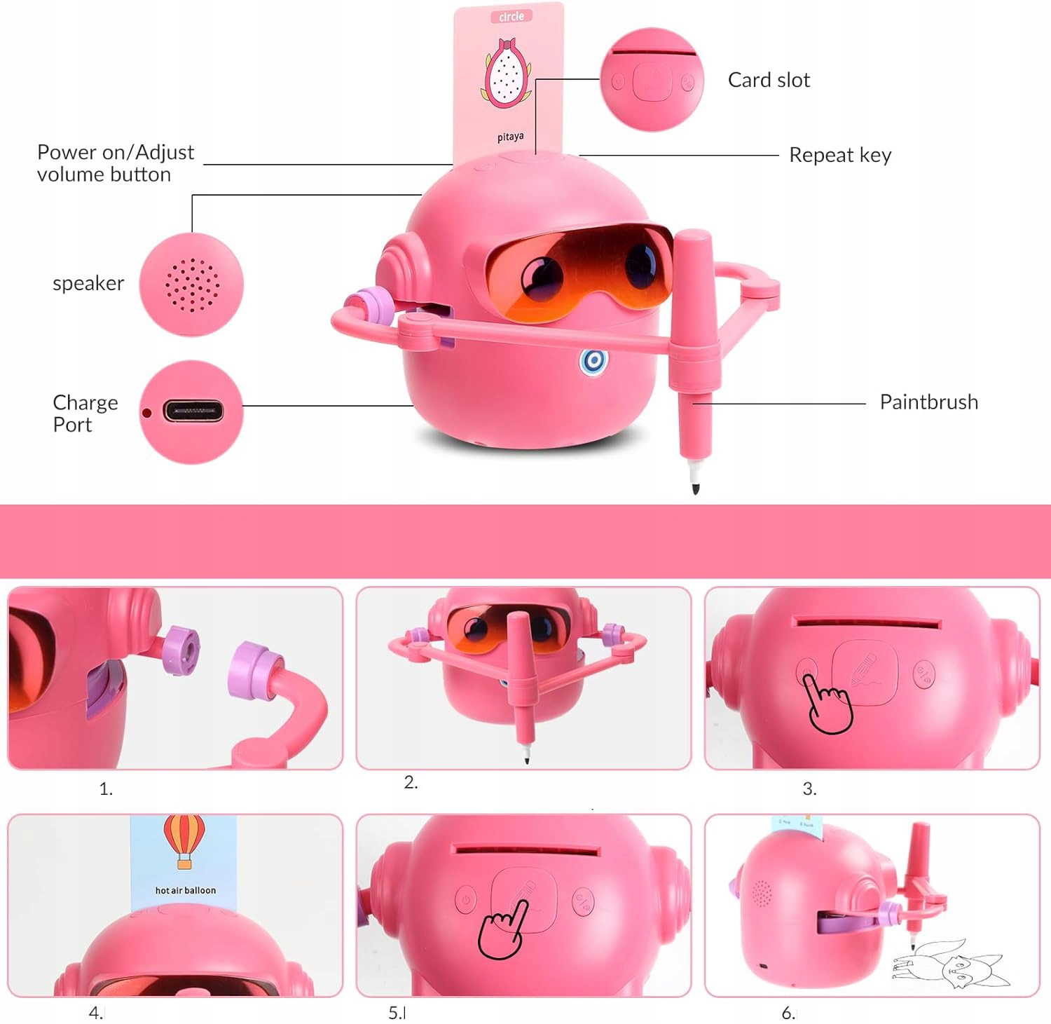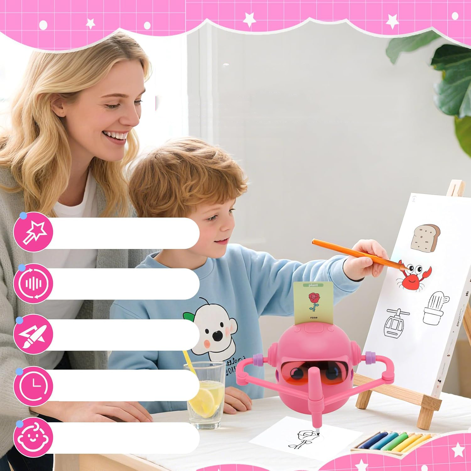 - ❤ 【Безпечний і милий дизайн】Малювальний робот, створений з урахуванням безпеки дітей, може похвалитися милим і чарівним дизайном, який водночас привабливий і функціональний. Виготовлений із високоякісних, безпечних для дітей матеріалів, він забезпечує дітям безпечне та веселе навчання.