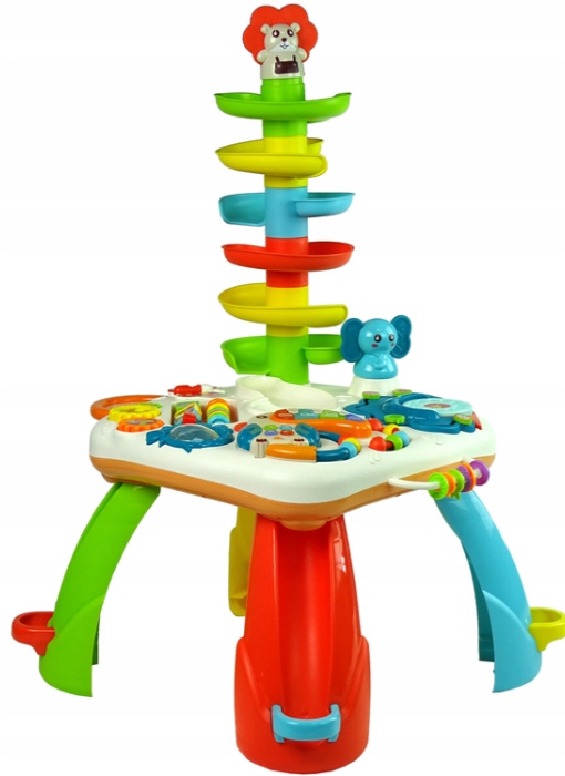 Поліпште рівень навчання вашої дитини за допомогою навчального столу! Ця весела інтерактивна іграшка має 6 барвистих платформ, які створюють веселу гірку, на вершині якої зображено усміхненого лева. Із задоволенням дивіться, як ваша дитина випускає одну з різнокольорових кульок і спостерігає, як вона скочується з гірки в спеціальні контейнери біля ніжок столу. Захоплюйте та розважайте свого малюка за допомогою цієї унікальної розвиваючої іграшки.