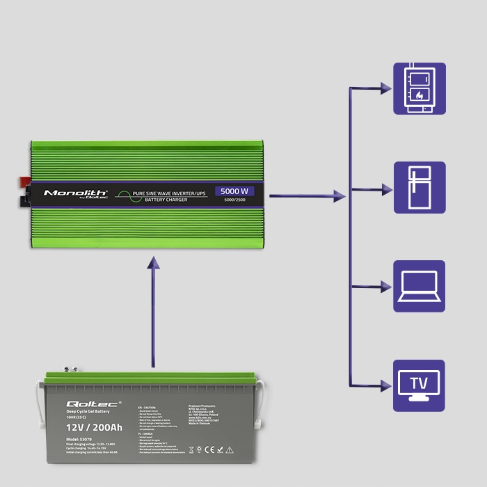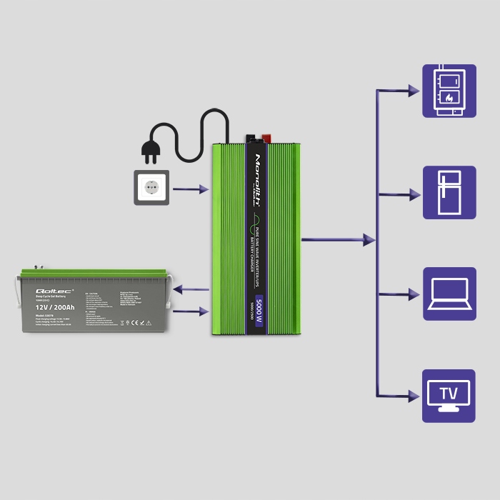 Претворювач бренду Qoltec чистий синус, виробляє той самий струм, що й у розетці 230 В, забезпечуючи безпеку для всіх підключених пристроїв. Він буде ідеальним як під час відключення електроенергії, так і під час подорожі, коли у нас немає доступу до розетки.