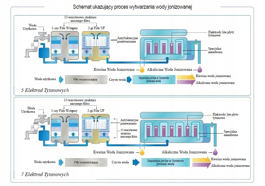 Вода містить різні мінерали, які система іонізації води завдяки процесу електролізу дуже вигідно перетворює на лужну іонізовану воду та кислу іонізовану воду, які тепер готові для домашнього використання.