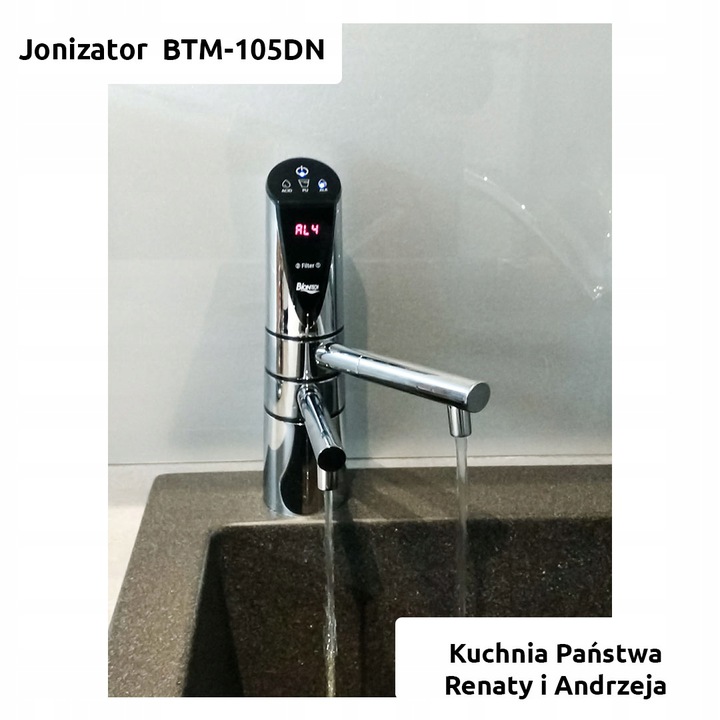 Модель Biontech BTM-105DN підключається безпосередньо до побутової води, що робить іонізатор надзвичайно простим у використанні, оскільки носик із зовнішнього боку мало чим відрізняється від традиційного змішувача. Сім титанових пластин із платиновим покриттям загальною площею 1568 см2 забезпечують тривалий термін служби приладу та найвищу якість води. Іонізована вода широко використовується в побуті і благотворно впливає на здоров'я всієї родини.