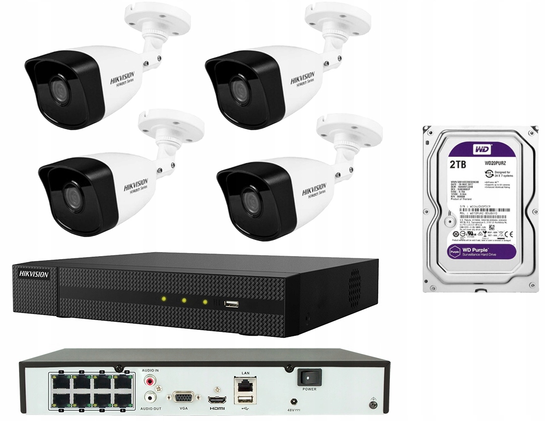 Комплект моніторингу HIKVISION HIWATCH для 4 IP-камер з роздільною здатністю 2560x1440p і широким кутом запису ~100 градусів, з можливістю розширення до 8 камер