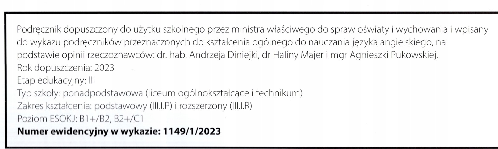 Пакет включає підручник з паперу та код активації для цифрового підручника, тобто Digibook. базовий та розширений рівень -це публікація, адресована учням чотирьохрічних середньої школи та п'ятирічній технічній школі, яка готується до іспиту з англійської Матури. Основна його частина - основний матеріал, і він доповнюється розширеними проблемами. Завдяки тому, що він поєднує в собі функції підручника та повторення, він дозволяє розвивати навички, зазначені в основних навчальних програмах, та систематичне розширення знань про лексичні та граматичні питання, вивчені на різних етапах вивчення мови. Наголошуючи на правильності мови. Систематичне навчання завдяки прозорому поділу матеріалу в окремих модулях у розділах: словниковий запас, практика навичок іспиту (прослуховування, використання англійської мови, письмо, говорю) та банк лексики. Банк письма та граматика. Польський