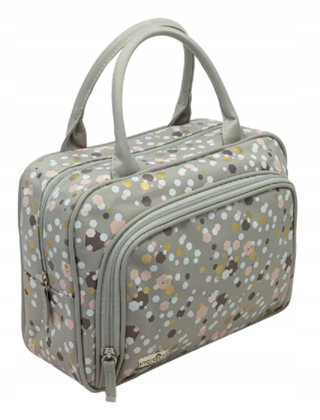 Виготовлений з високоякісного водонепроникного матеріалу в домінуючому сірому кольорі з пастельними шестигранниками різних розмірів. Внутрішня частина кейсів акуратно оброблена підкладкою попелястого кольору, всередині є перегородка, що ділить кейс на дві частини, які можна від'єднати, еластичні стрічки, які утримують косметику у вертикальному положенні, і дзеркало на дверцятах, що закриваються, яке можна від'єднати за допомогою липучки. Ззаду чохла є додаткова кишеня для косметики поменше, основне відділення і задня кишеня закриваються на блискавки. Оснащений міцною складною пластиковою ручкою і регульованим плечовим ременем. Багажник повністю жорсткий знизу і оснащений пластиковими ніжками для запобігання намокання або забруднення. На передній частині є металевий логотип виробника REED, ідеальний для походів у ванну кімнату.