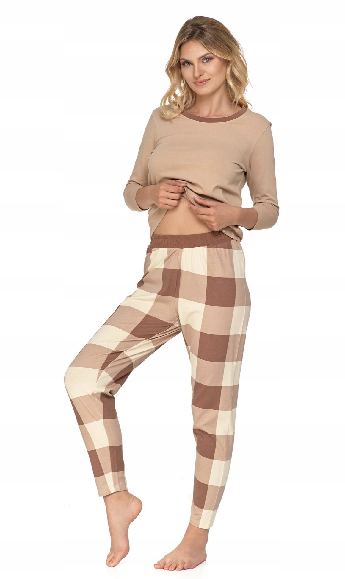 Жіноча бавовняна піжама з 3/4 рукавами та плед -штанами в класичному елегантному стилі, що забезпечує комфорт та комфорт носити всю ніч. Кругле декольте в делікатному теплому відтінку бежевого, ідеально підходить для більш прохолодних вечорів. 4 У