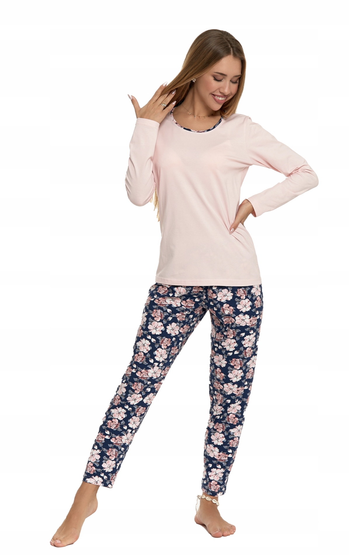Пропонована жіноча піжама - це зручний нічний комплект з довгими рукавами, виготовлений з високоякісної бавовни. Верхня частина, тобто футболка, забезпечує тепло завдяки довгим рукавам, а довгі штани вільного прямого крою з еластичним поясом доповнюють її. Ця квіткова піжама є ідеальним вибором для тих, хто цінує комфорт, натуральні матеріали та більше покриття тіла під час сну.