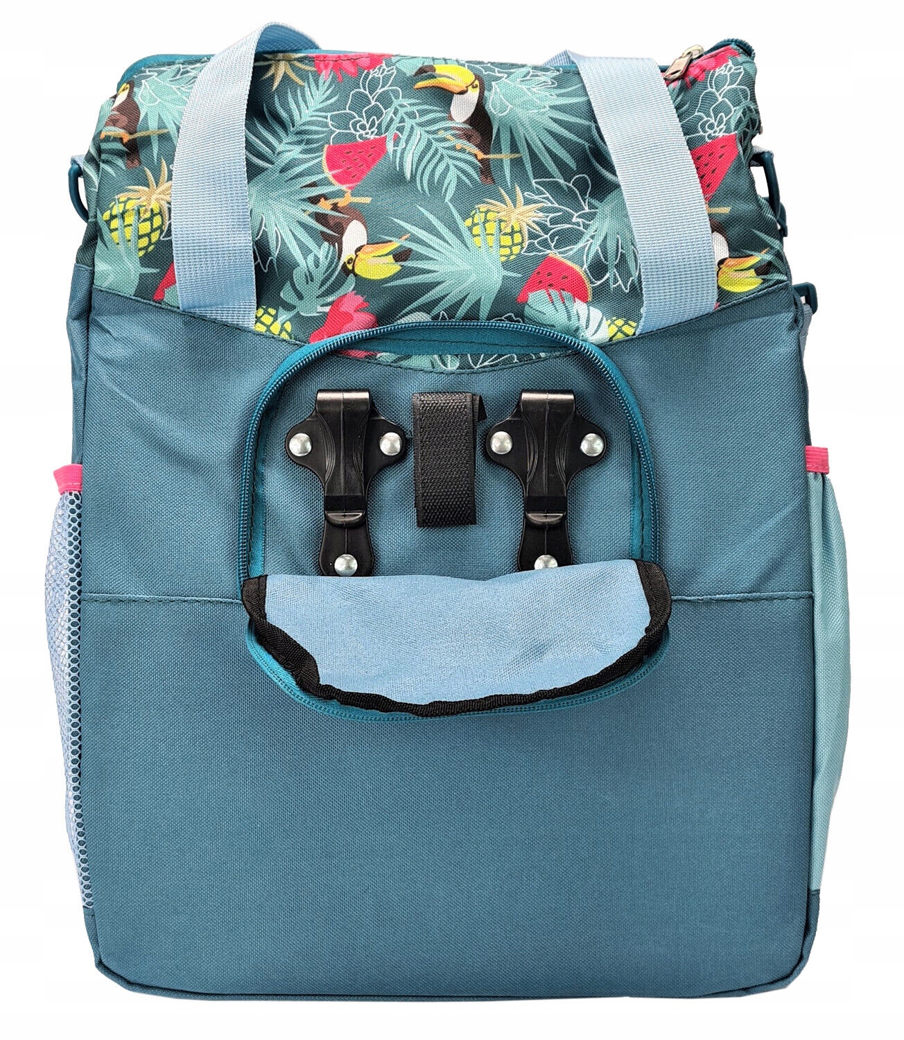 Ця синя сумка з екзотичними візерунками та рожевими елементами не лише виглядає модно, але й пропонує багато практичних рішень. Оснащений містким основним відділенням, він дозволить вам заховати кілька необхідних речей під час їзди на велосипеді.