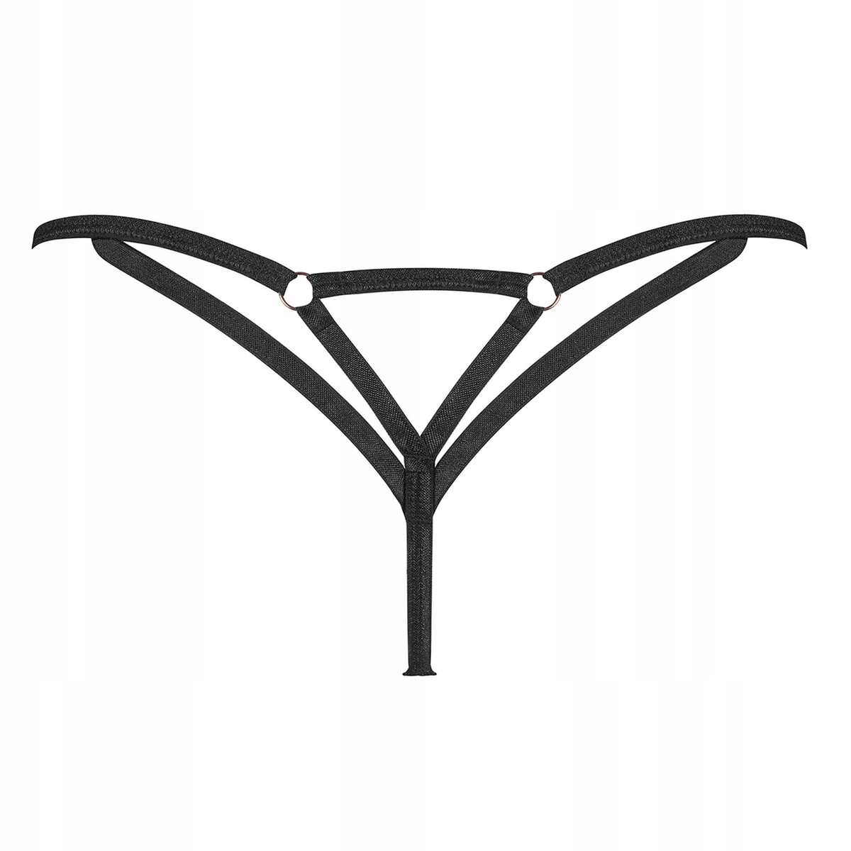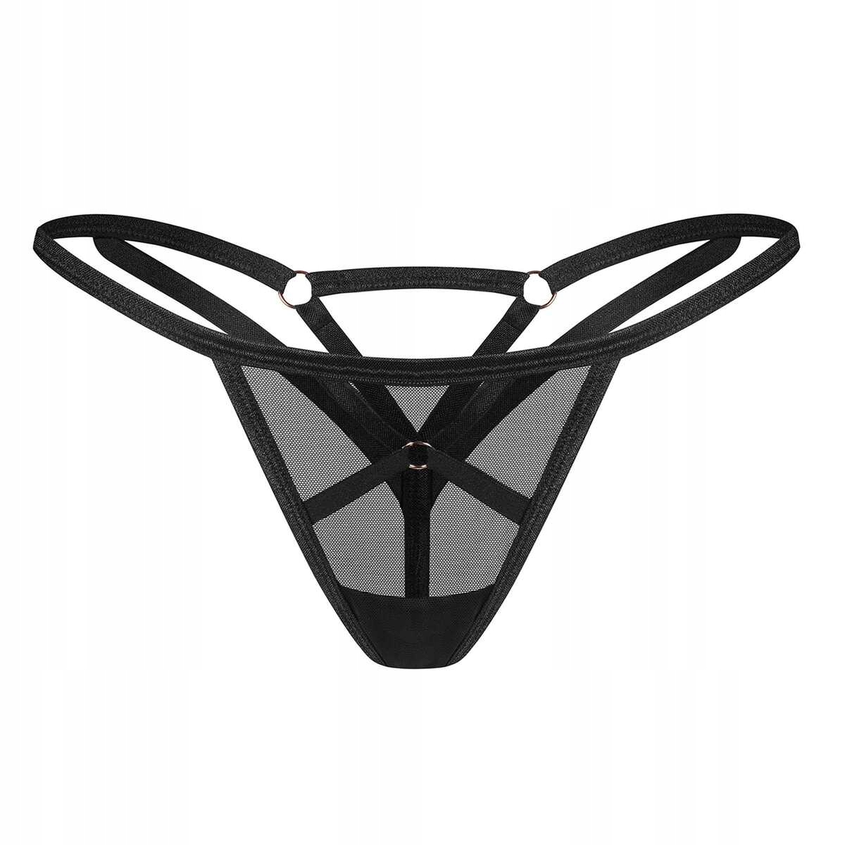 Сміливі стрінги класичного чорного кольору, виготовлені з прозорого матеріалу, який інтригуюче відкриває та підкреслює вигини. тіло. Смуги, що створюють геометричний візерунок, додають чуттєвості, а деталі у відтінку рожевого золота вносять нотку елегантності та розкоші. Це модель, створена для веселої та спокусливої гри, повної напруги та витончених жестів.