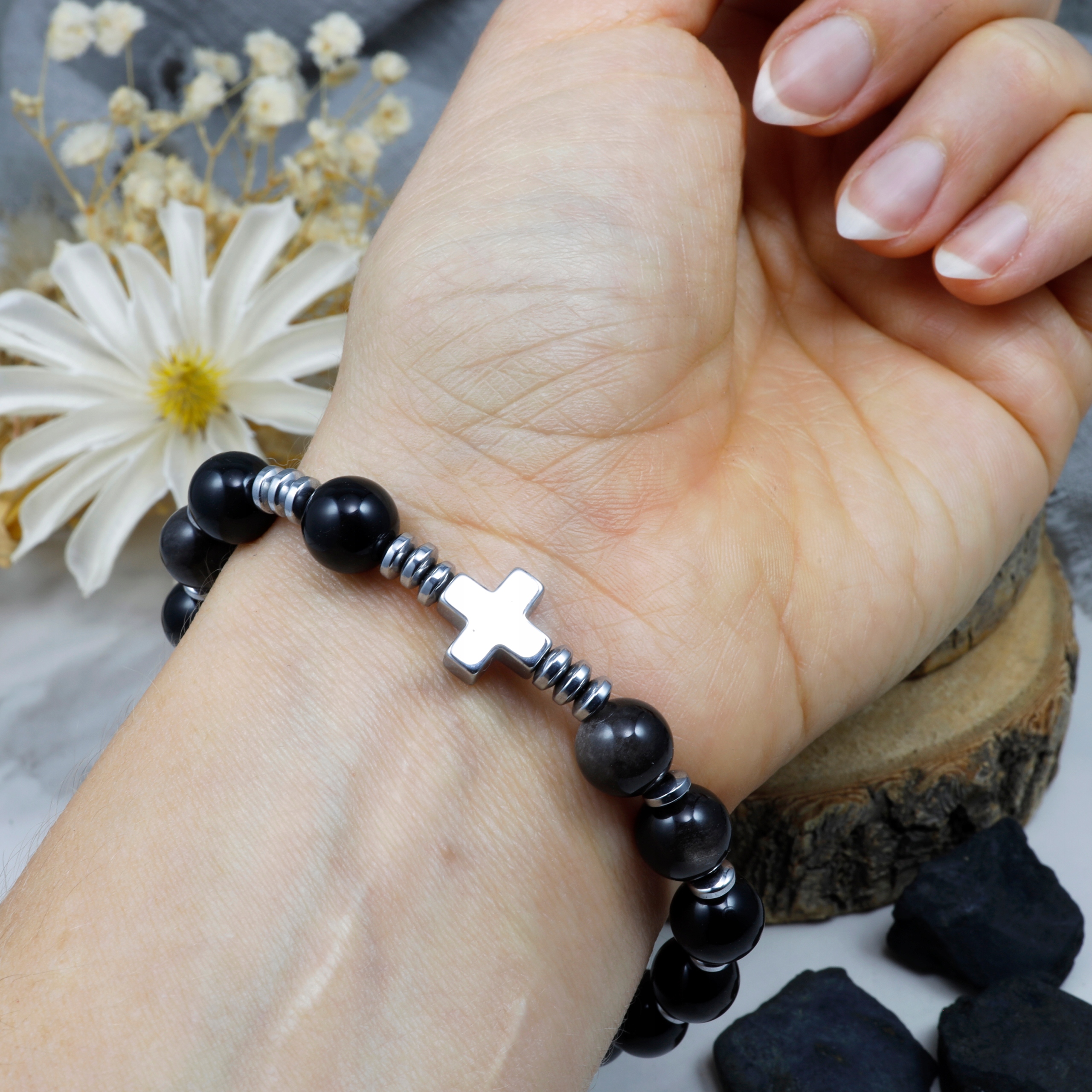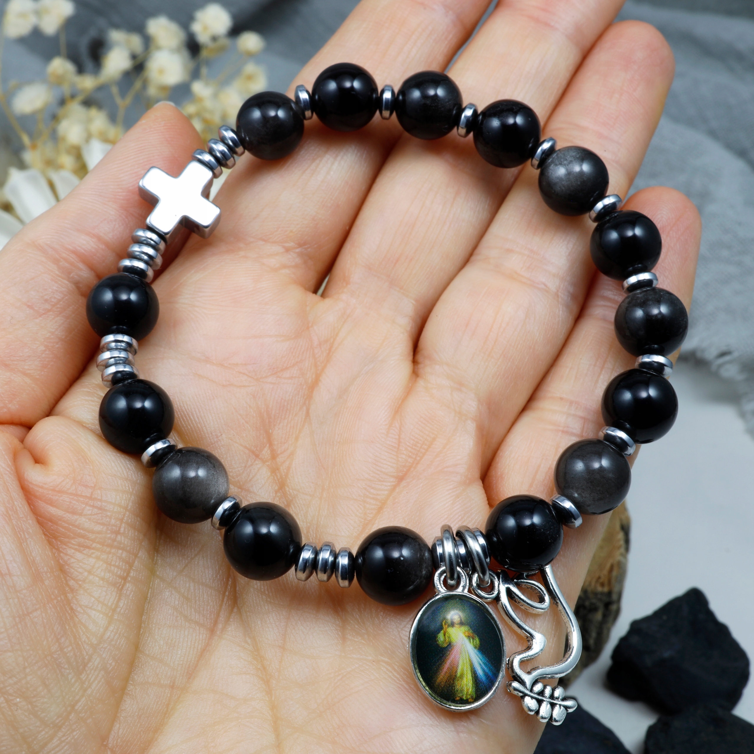ЖІНОЧИЙ браслет РОЗАРІЙ на руку з десятьма камінням, СРІБНИЙ ОБСИДІАН
