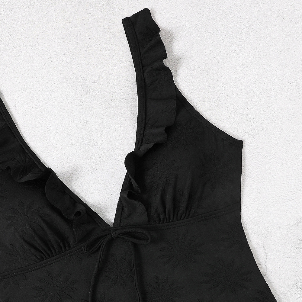 - Цілий купальник. Він використовує елегантний і сексуальний крой, V-подібний виріз із рюшами та технологію горловини-банта, що робить купальник менш монотонним.