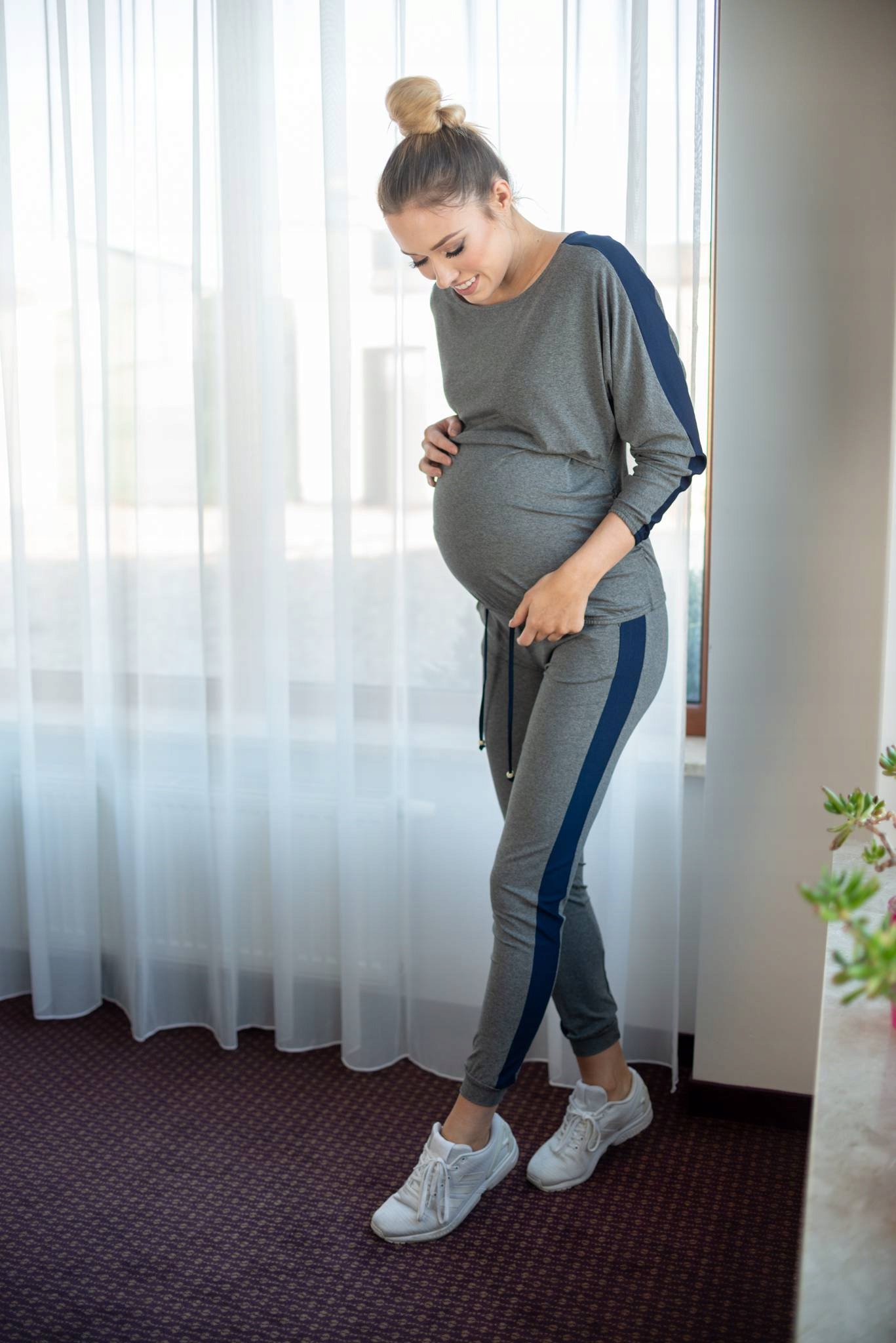 Спортивний комплект для майбутніх і нинішніх мам. Класичний, але створений спеціально для мам комплект спортивного костюму - це поєднання зручних штанів на гумці та світшоти, який завдяки відрізному верху дозволяє комфортно годувати малюка, а завдяки рюшам з боків ідеально сидить на зростаючому вагітному животику.