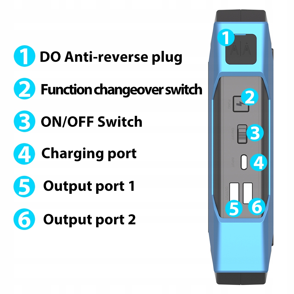 - Набір «Road Trip 4 в 1» — цей продукт являє собою портативний автомобільний стартер, портативний акумулятор на 20000 мАг, аварійний світлодіодний ліхтарик і Джерело живлення автомобільного аксесуара 12 В постійного струму. USB-порт може заряджати смартфони, планшети тощо; вбудований 4-режимний світлодіодний ліхтар для допомоги в темряві або в екстрених ситуаціях; Крім того, він також може живити 12 В постійного струму автомобільні аксесуари, такі як компресори для шин, автомобільні пилососи тощо.