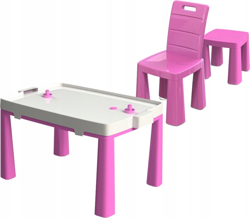 Практичний набір дитячих меблів, який легко трансформується в набір для аерохокею завдяки накладці на стільницю. Крім того, стілець функціонує як табурет, просто сфотографуйте спинку. Набір виготовлений з високоякісного матеріалу.