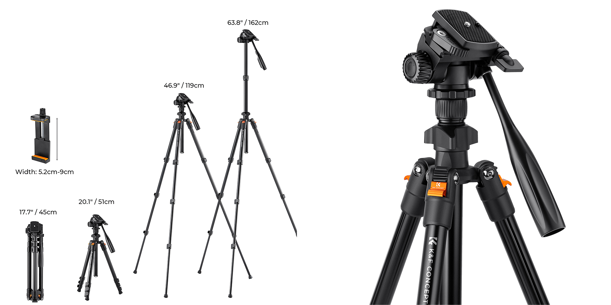 k & f концепція k234a0 - ідеальний вибір для фотографів, мандрівників та влогерів. Завдяки використанню легких матеріалів він важить лише 1,26 кг. Після подання до транспортної позиції він вимірює 45 см. Завдяки цьому ви можете легко прикріпити його до рюкзака або упакувати його в валізу для подорожей. Після розгортання ви можете насолоджуватися аж 177 см максимальної висоти роботи.