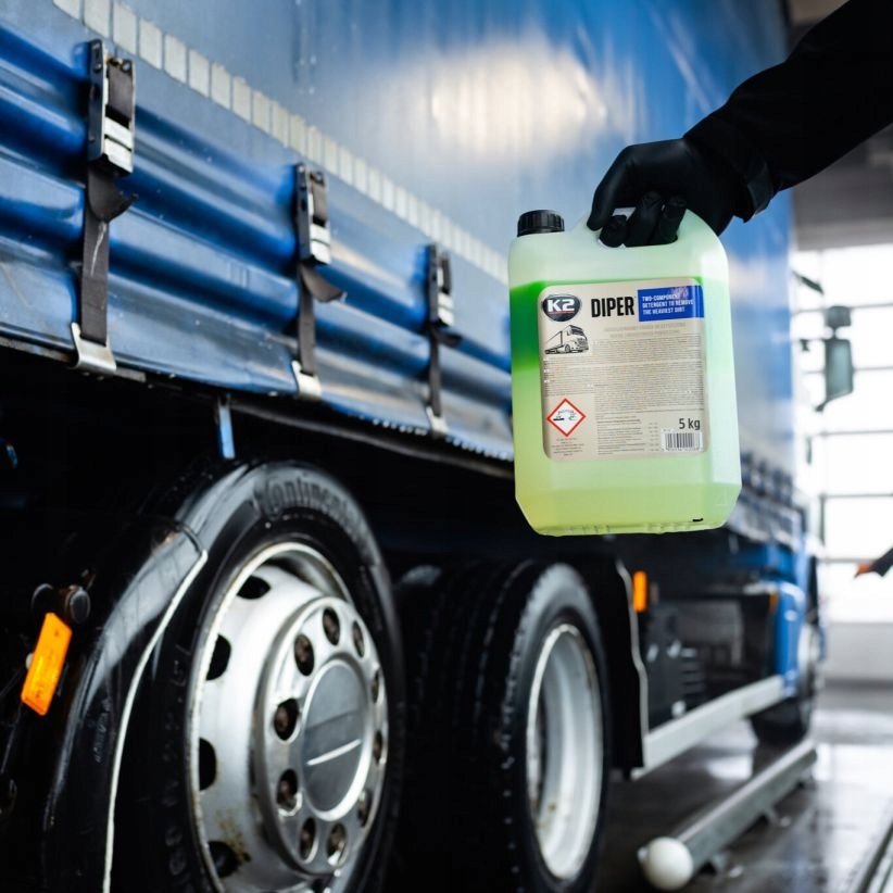 Двокомпонентний лужний миючий засіб високої концентрації, з піноутворюючими властивостями, ефективний навіть для найсильніших забруднень на кузови та брезенти автомобілів, що використовуються на бортових платформах та вантажівках тощо. Також чудово підходить для вагонів-цистерн, підлог у гаражах та станціях технічного обслуговування, механічних цехах та фабричних сараях. У концентрованому вигляді продукт має два шари, але ідеально змішується при розведенні для використання.