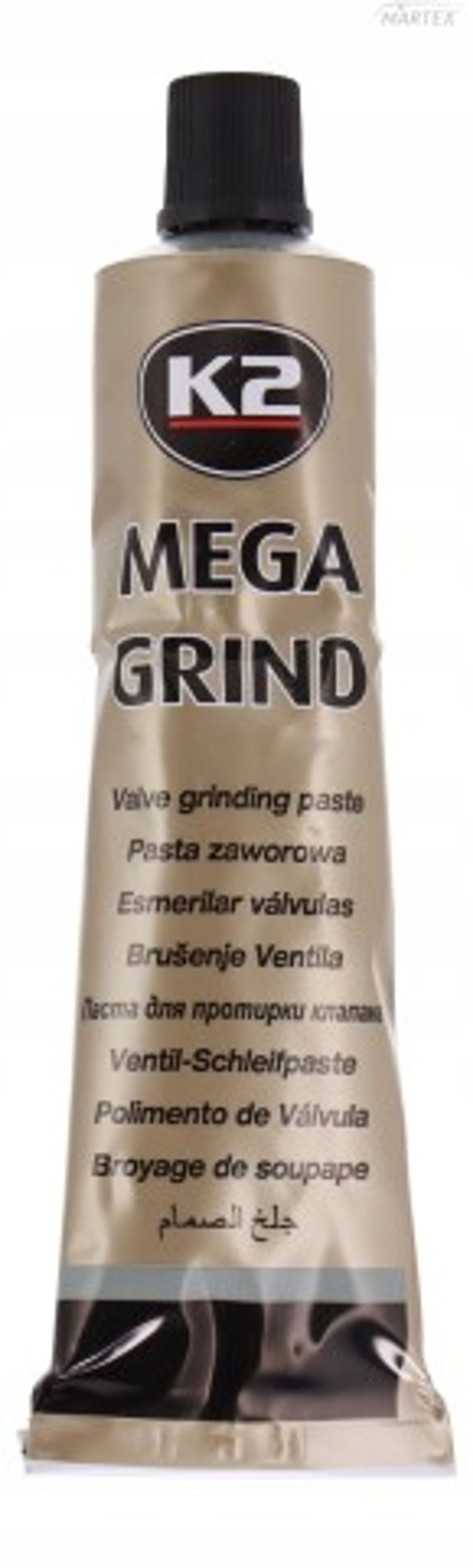K2 MEGA GRIND - інноваційна паста для притирки клапанів і сідел клапанів у двигунах внутрішнього згоряння. Призначений для використання у всіх типах двигунів (бензинових, дизельних, LPG та ін.). Завдяки сучасній формулі він допомагає згладити та поєднати всі металеві поверхні, напр. сідла та пробки клапанів без особливих зусиль. Ефективно видаляє пошкодження, потьмяніння, відкладення та корозію з металевих елементів, забезпечуючи таким чином ефективну роботу системи клапанів. Можна використовувати ручним і машинним способом. Продукт призначений для професійного використання.
