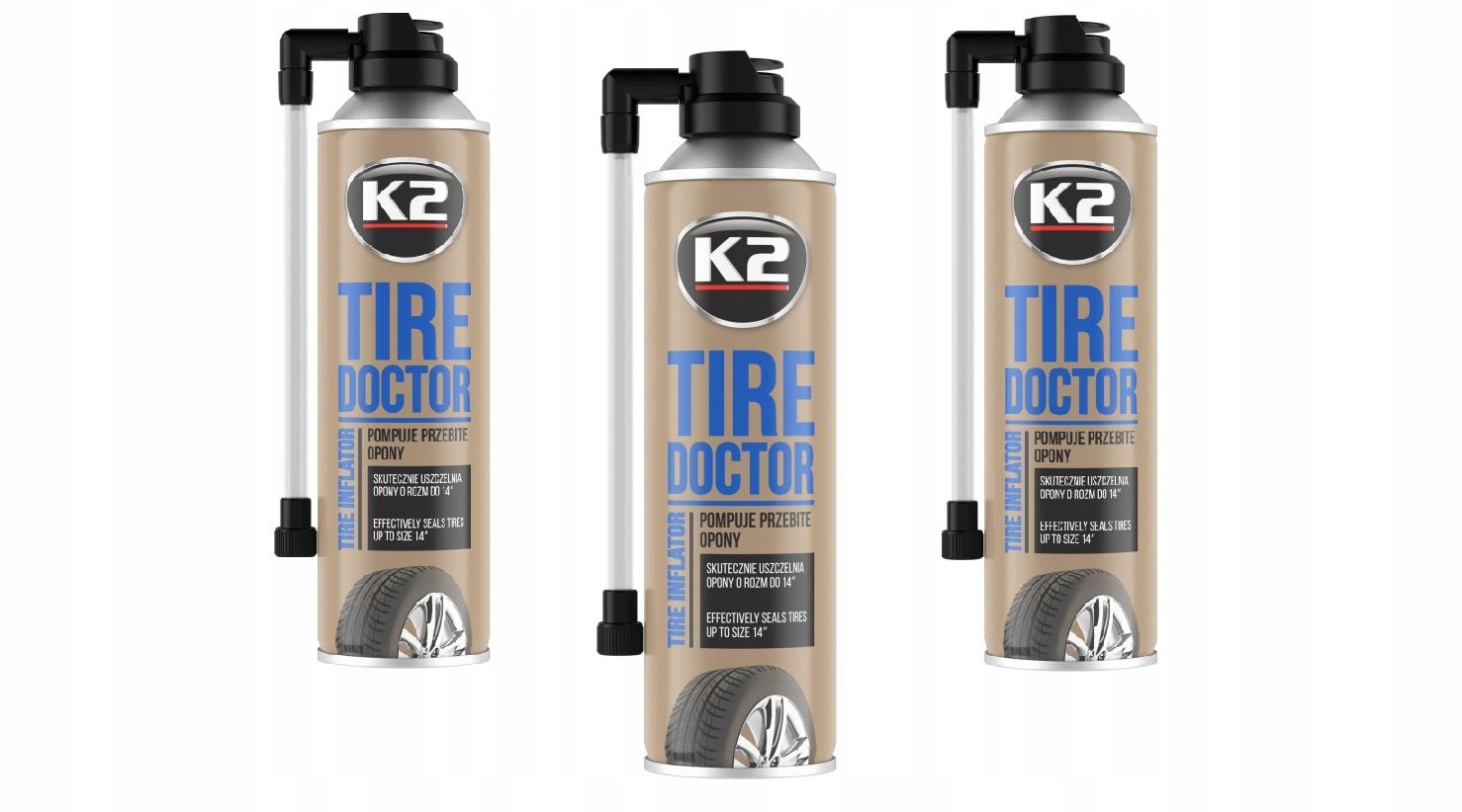 K2 Tire Doktor швидко та ефективно накачує та заклеює проколоті шини - тимчасовий ремонт без розбирання та використання інструментів . Аерозоль накачує шину, а спеціальна латексна формула закриває отвір. Препарат не впливає на балансування коліс. Накачує шини розміром до 14".