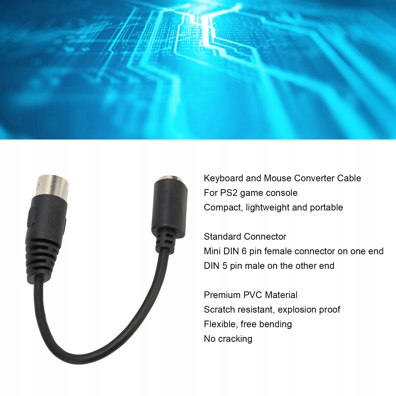 2. Стандартний роз’єм: для адаптерного кабелю PS2 для клавіатури та миші один кінець — роз’єм Mini DIN 6, а інший — роз’єм DIN 5, міцне та надійне з’єднання.