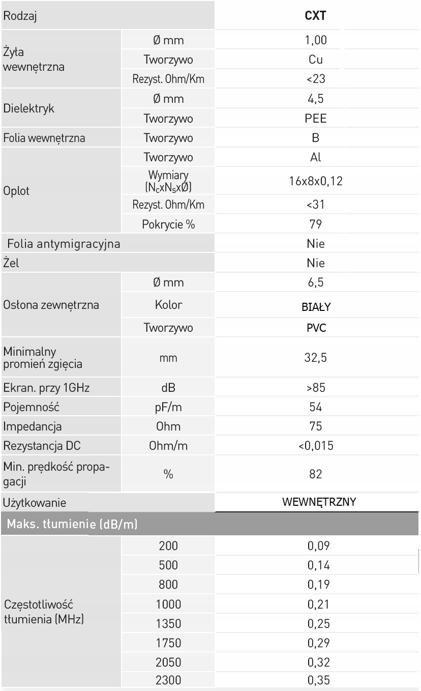Внутрішній дріт кабелю Televes CXT діаметром 1 мм виготовлено з міді. Екрануюча фольга і оплетка кабелю виготовлені з алюмінію з покриттям 79%, що забезпечує повну відповідність стандарту класу А. Кабель має дуже хороші параметри загасання і може використовуватися в установках до 3 ГГц.