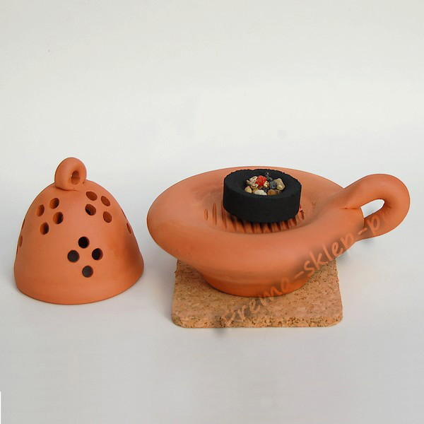 Випалювач глини. Випалюють у печі, що робить його стійким до температури розжареного вугілля. На відміну від металевих кадильниць, керамічна кадильниця нагрівається не так швидко, тому її можна сміливо носити з собою. У комплекті дерев'яна підставка для кращої теплоізоляції від землі.