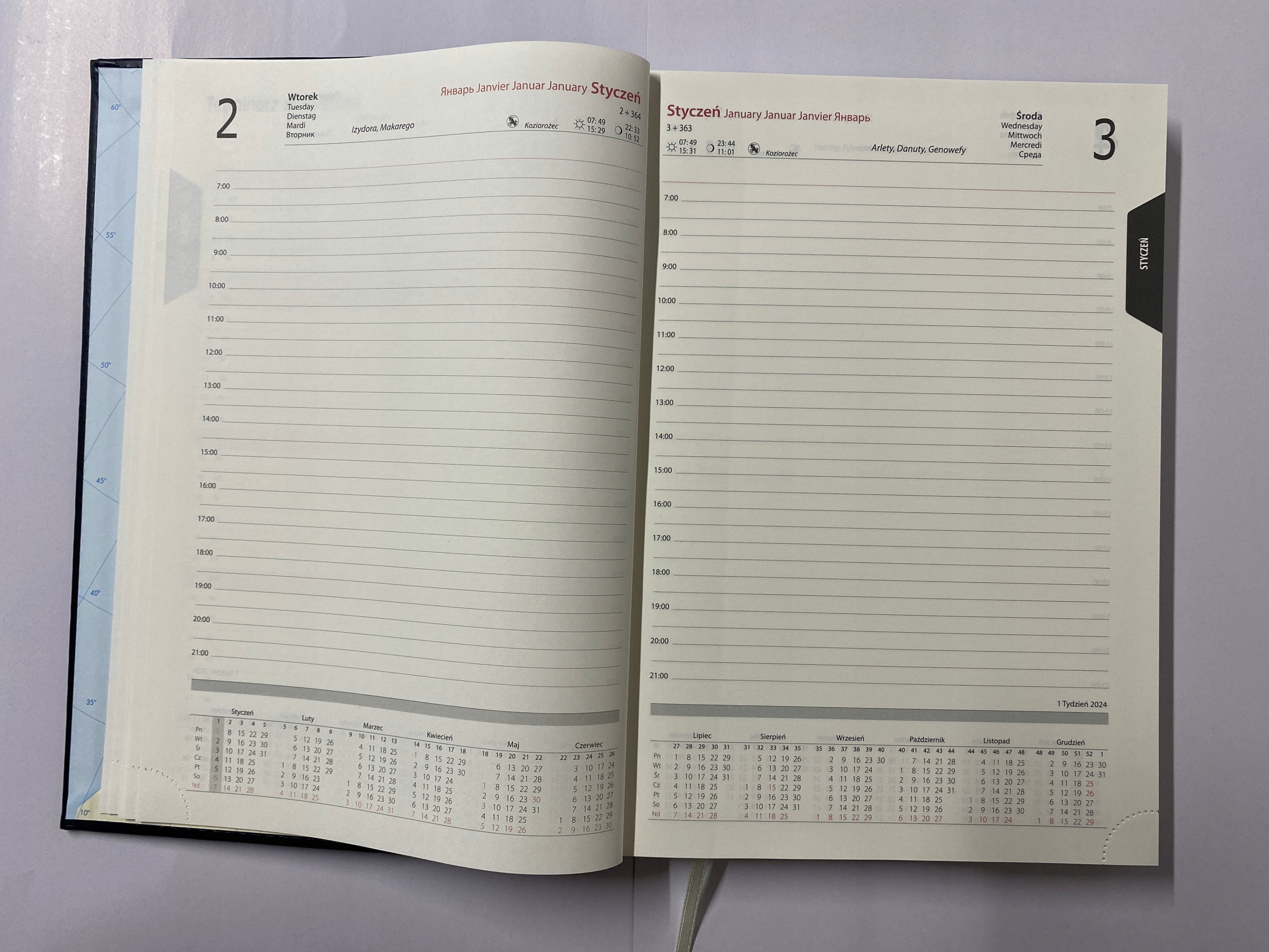 - Макет: 1 день на 1 сторінка, субота та неділя по 1 сторінці, місячний план перед кожним місяцем