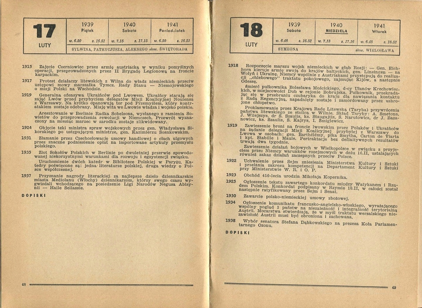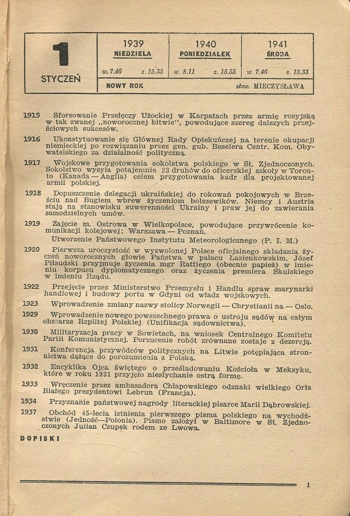 Хроніка 3900 подій періоду 1914-1939 рр., розташована хронологічно на кожен день календар. Містить 20 історичних карт і календар на 1939-1940-1941 роки. Загальна редакція та повна підготовка хроніки 1914-1939 рр.: М. Величко.