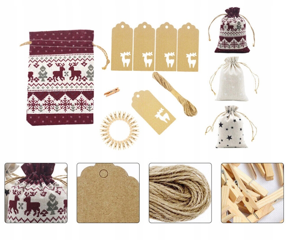 - ідеальна пропозиція для тих, хто хоче додатково збагатити атмосферу та магію очікування Різдва! Діти люблять сюрпризи, і здогадування себе приносить їм багато хороших емоцій. Допередодні Різдва вони щодня дотягнуться до невеликого подарунка, щоб розпакувати його від хвилювання. Крім того, особливо менших дітей, вони вчаться вимірювати дні та вивчати правила проходження часу . 24 Джутові мішки для незалежної начинки забезпечать всій родині багато радості в очікуванні Різдва.