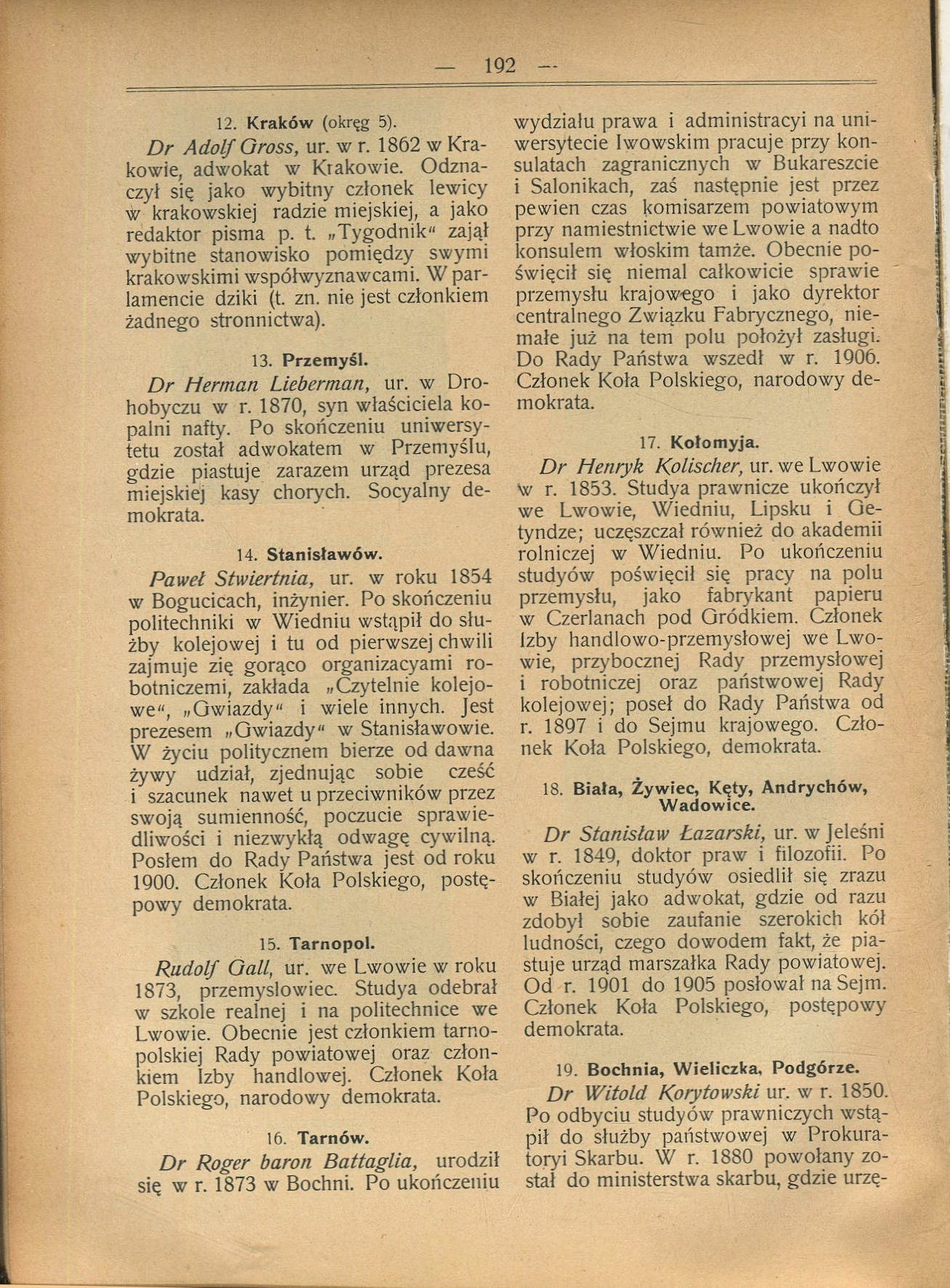 - Маленький домашній схематизм: C. k. Намісництво, репрезентація країни, список членів і депутатів народного сейму, список адвокатів у Кракові, Львові та на провінціях, список нотаріусів, список уповноважених урядом цивільних техніків Королівства Галичини та Лодомерії.