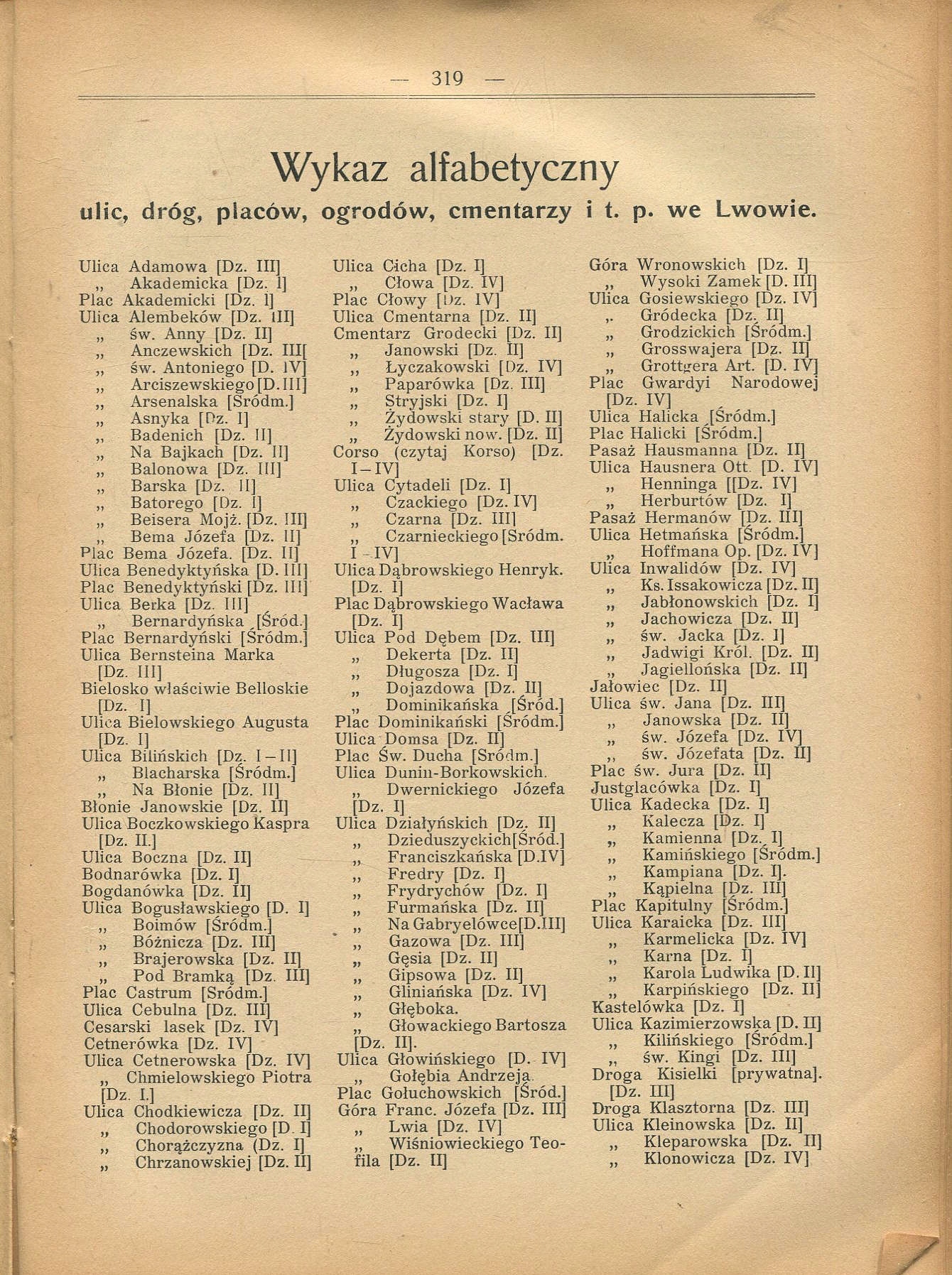 - Львівський шематизм: члени міської ради, делегати міської ради, магістрат, повітова шкільна рада, список лікарів, аптеки, парафії, перелік вулиць, доріг, майданів і цвинтарів, консульств і таксі, тариф плати за проїзд у фіакрах, міський електричний трамвай, автомобілі, адресний довідник по місту Львову, поради тим, хто їде на аудієнцію та інше.