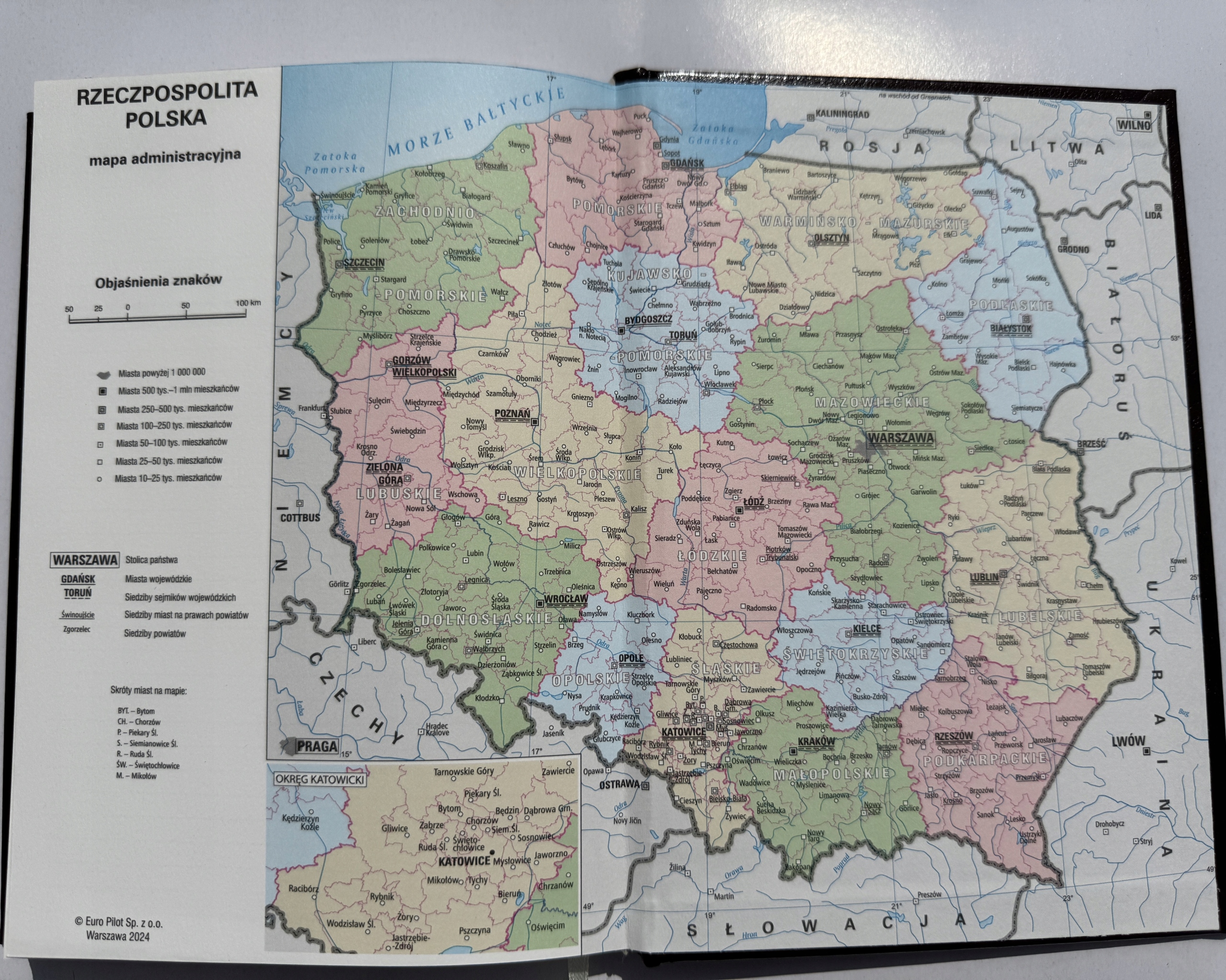 Календар на 5 мовах: PL, GB, D, RUS, FR, іменини та свята, фази місяця , світанки та заходи сонця, внизу календаря план цілого року