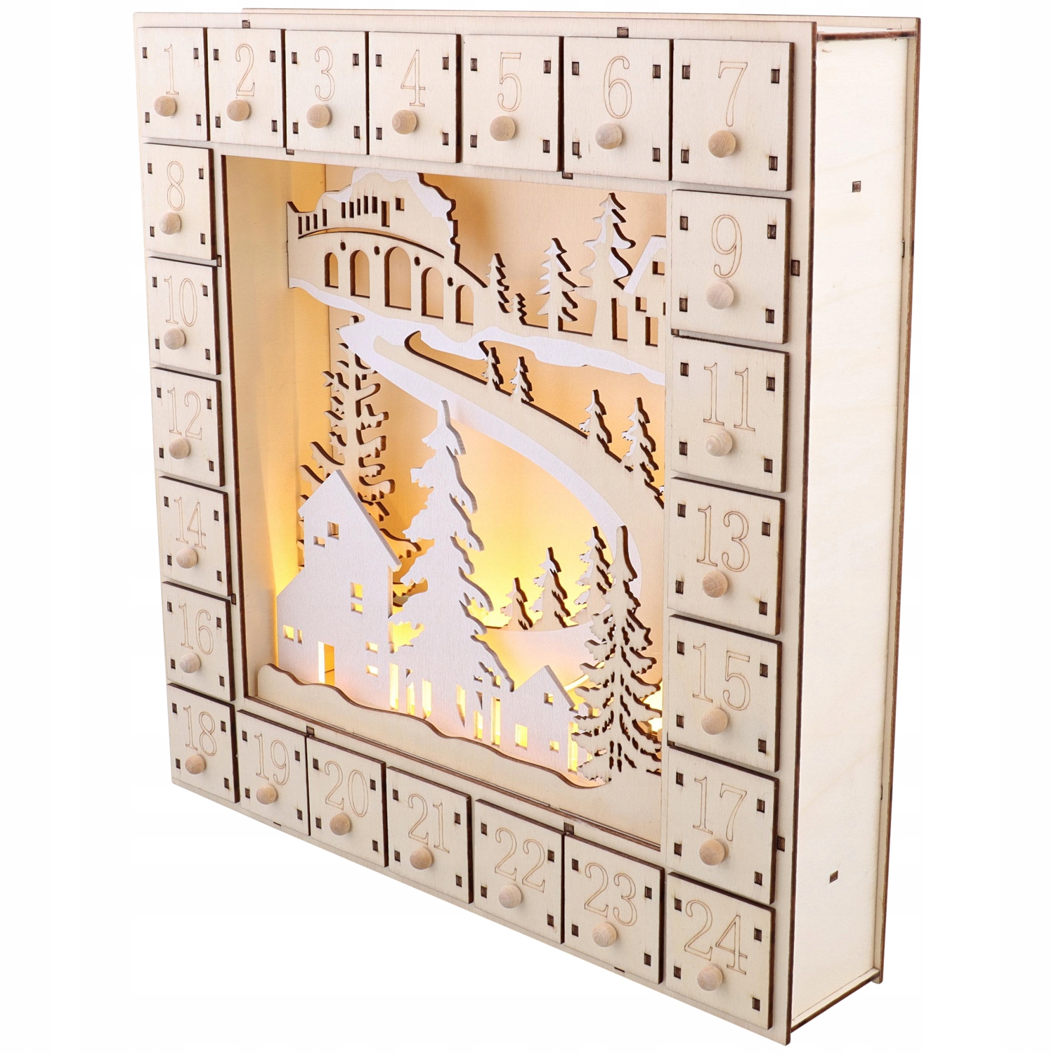 KALENDARZ ADWENTOWY DREWNIANY DREWNO FSC Z OŚWIETLENIEM LED 24 SZUFLADKI