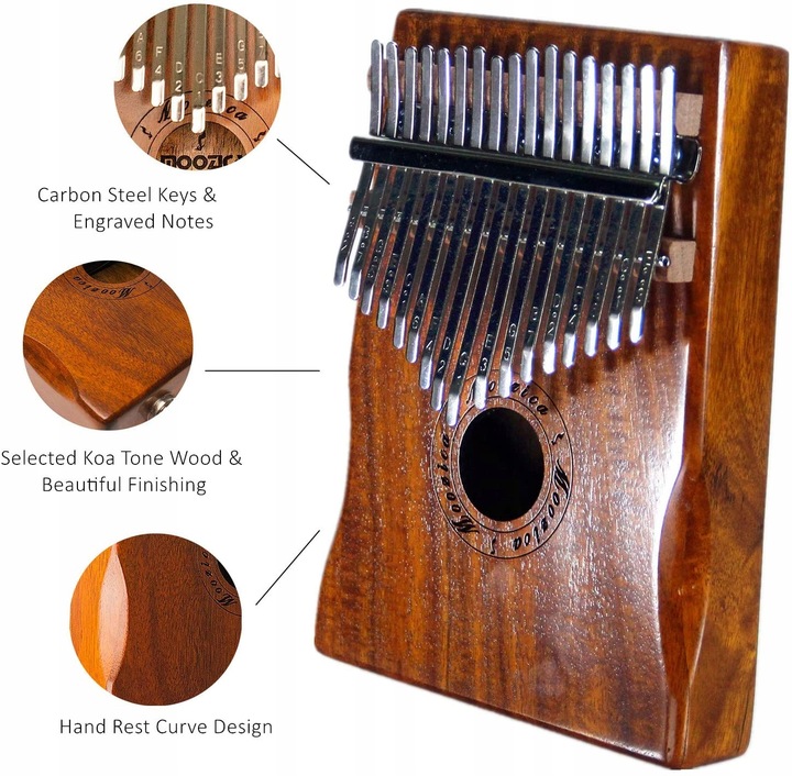 Вибрані зуби, виготовлені з деревини акації коа та металевої руди, забезпечують теплий і глибокий звук калімби. Грати в калімбу з дітьми та коханою людиною завжди буде дуже весело!