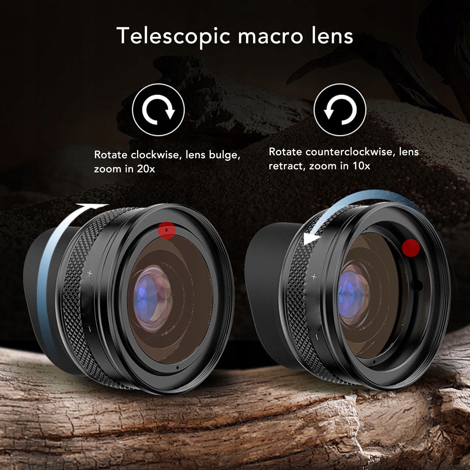 4. Макрооб’єктив 20X: ідеально підходить для зйомки великим планом. Збільшуйте об’єкти поблизу з приголомшливою суперблизькістю. Макрооб’єктив вловлює всі тонкощі та деталі з точним фокусом для чітких макрознімків щоразу. Ідеальна робоча відстань між об’єктивом камери мобільного телефону та об’єктом, що переглядається, становить від 15 до 45 мм.