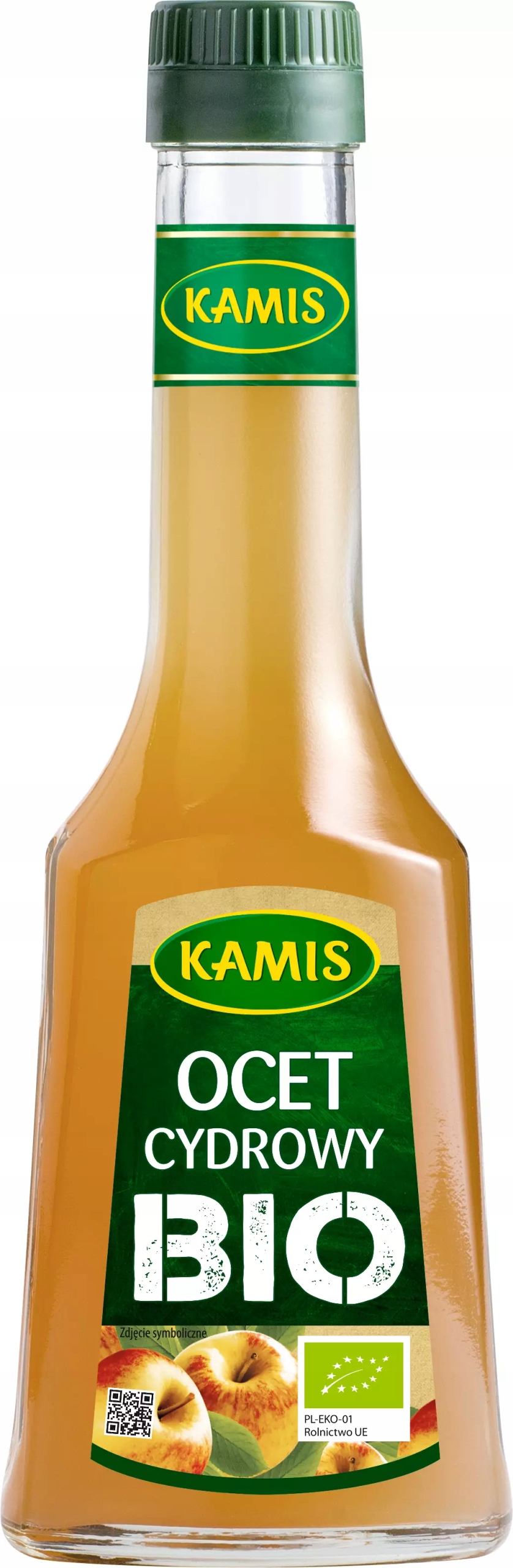 Оцет Kamis в органічній версії - це натуральний, екологічний продукт, виготовлений з органічних яблук. Характеризується м’яким фруктовим смаком, який ідеально підкреслює смак салатів, маринадів та інших страв.