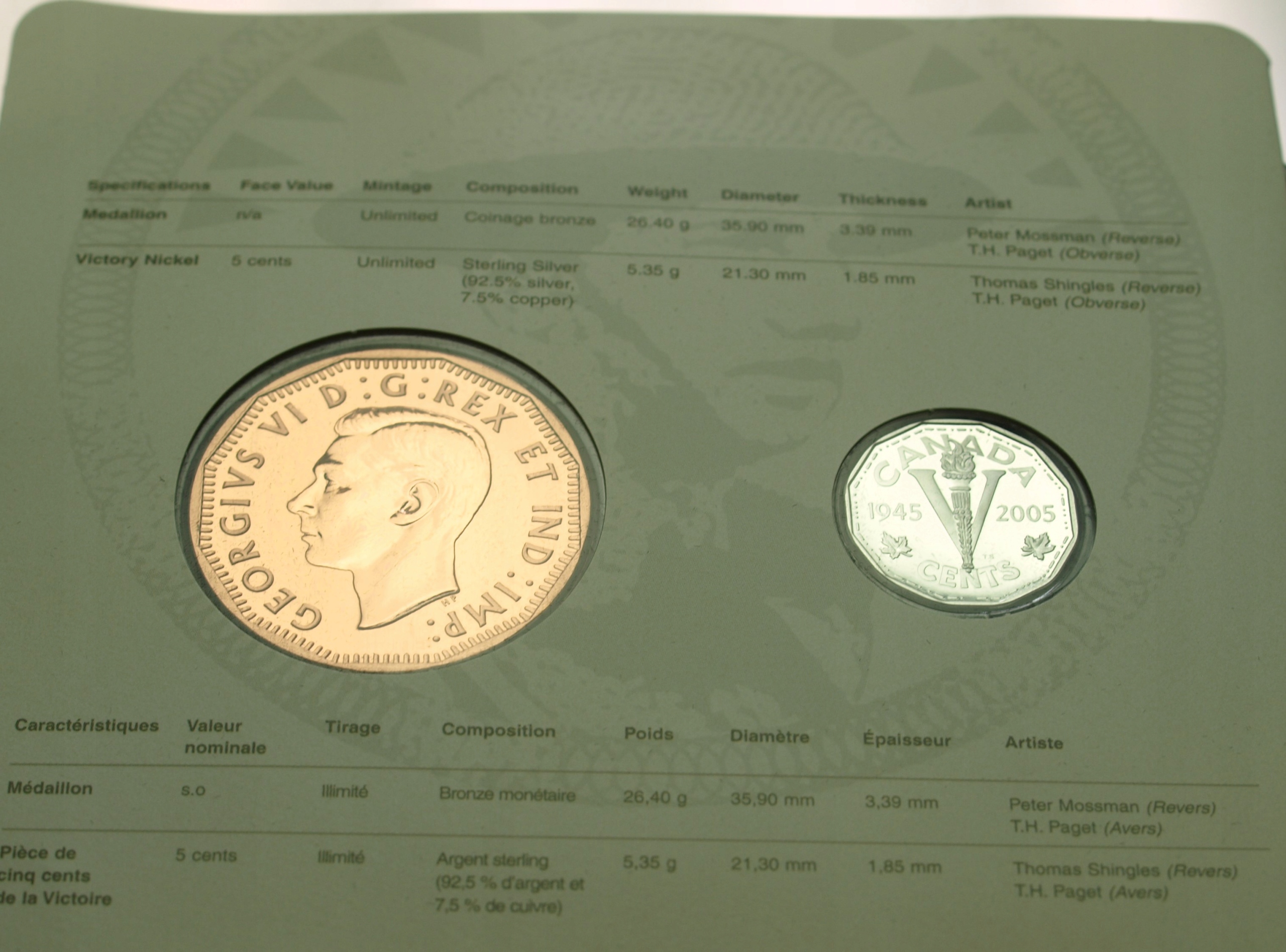 Канада встановила 5 центів та медаль 2005 VES, що виграє день 1945 року. Оригінал. Ознайомтеся з іншими аукціонами - збирайте рідкісні значення з Numismrato!