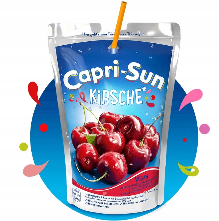 Унікальна упаковка напоїв Capri-Sun і чудовий освіжаючий смак є невід’ємною частиною літа в багатьох країнах. Їх люблять як маленькі, так і великі любителі соків, і вам вони теж сподобаються. Саме вчасно, щоб задовольнити ваше бажання. Фольга та зручна упаковка з соломинкою ідеально підходить для подорожей. Ви зможете дотягнутися до нього в будь-який момент і насолодитися його вишневим смаком. Тепер ароматний та освіжаючий напій містить 6% вишневого соку.. :)