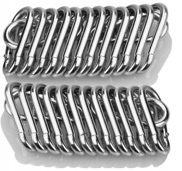 Карабін для мотузки, пружинне закриття. Карабіни оцинковані, що робить їх стійкими до мінливих погодних умов. Покриття захищене від корозії.
