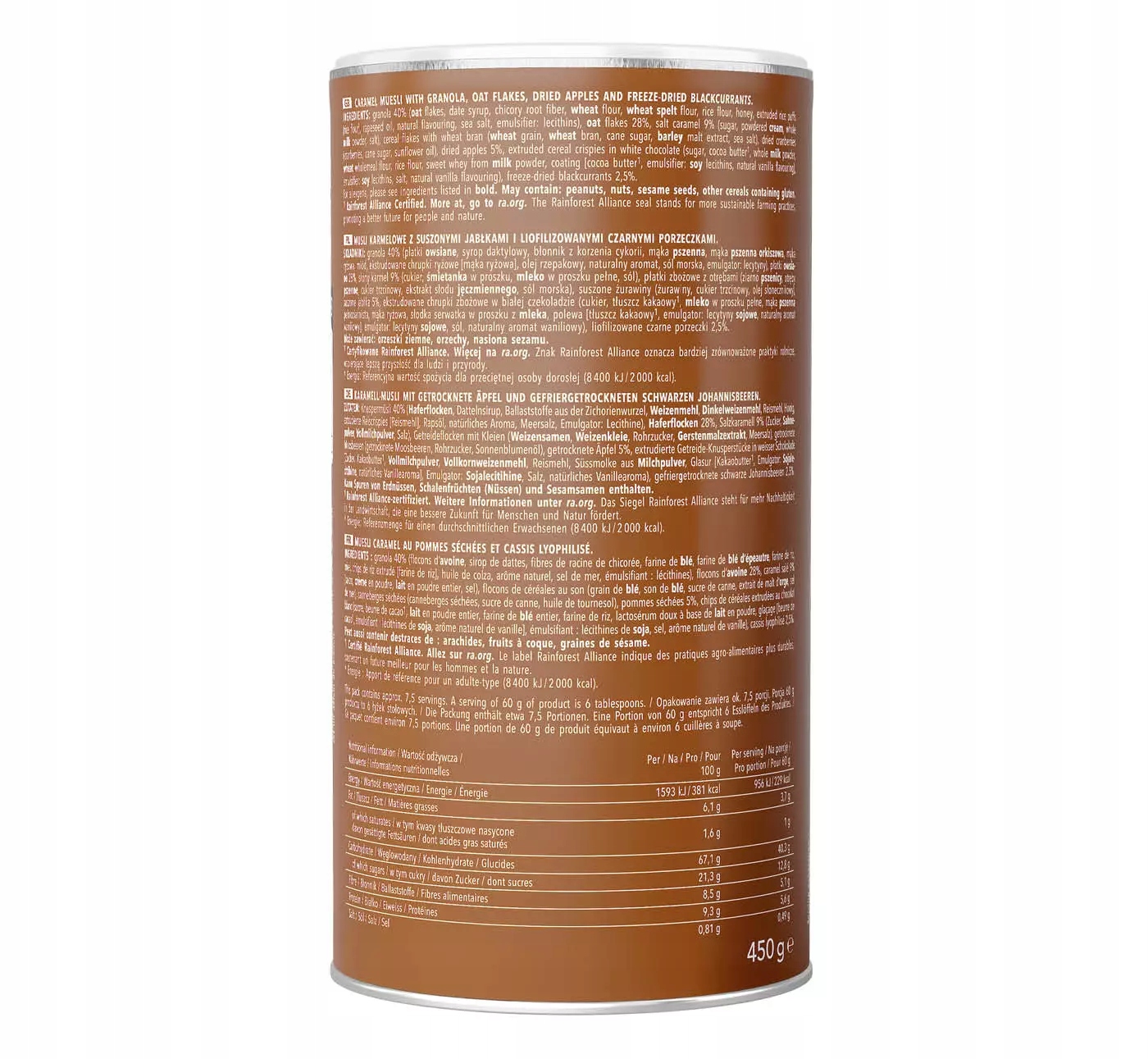 Дозвольте собі здивуватися дивовижним поєднанням ароматизаторів карамель, солодких зернових чіпсів, покритих білим шоколадом та солодким та кислим журавлицею та сушеними чорними смородиночками. Смачний сніданок довго поставить вас у гарному настрої! Ganola 40% (вівсяна каша, сироп побачення, кореневе волокно цикорію, пшеничне борошно, написане пшеничне борошно, рисове борошно, мед, екструдований рис хрусткий [рисове борошно], ріпаку, натуральний аромат, морська сіль, емульгат: лецитін), вівсяна оваза, 28%, крем -церейн (цукор, крем, порошки пшеничні висівки, тростинний цукор, екстракт солодового ячмінного солоду, морська сіль), сушена журавлина (журавлина, тростинна цукор, соняшникова олія), сушені яблука 5%, екструдований зерновий чашок білого кольору. Шоколад (цукор, какао, повне порошкове молоко, цільнозернове пшеничне борошно, рисове борошно, солодка сироватка в молочному порошку, начинки [какао жир1, емульгатор: соєві лецитини, натуральний аромат ваніль], емульгат: соєві лецитини, сіль, аромат натурального ваніль), дрілить чорні гарнірин 2,5%.