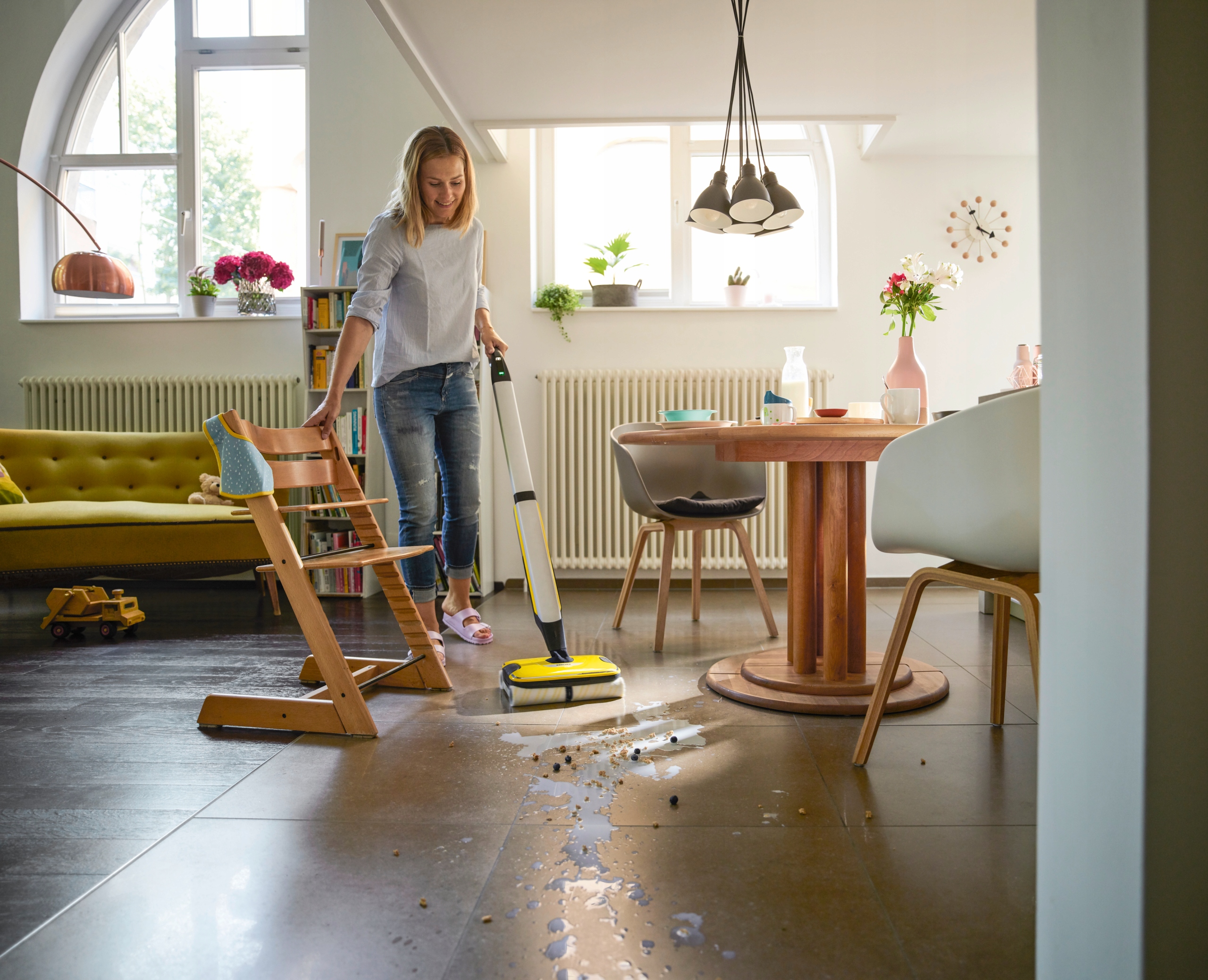 Незалежно від того, чи миєте ви підлогу з дерева чи каменю - електрична швабра FC 7 у поєднанні з відповідними миючими засобами ідеально подбає про будь-який тип підлоги в квартирі. Завдяки подушечкам з мікрофібри та невеликій кількості вологи, що залишилася, він також підходить для чищення паркетної підлоги.