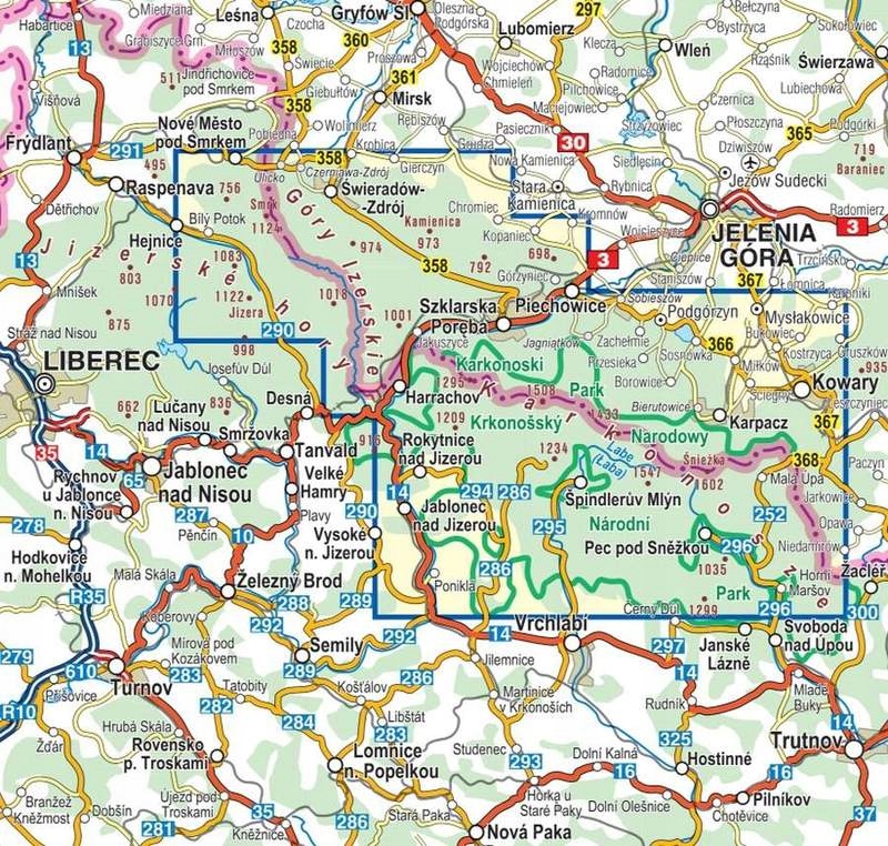 Карконоше Гори Єзерські гори – це двостороння карта у великому масштабі 1:35'000. На одному аркуші — карта масиву Карконоше, на другому — карта Єзерських гір, плани (центрів міст) Сверадува-Здруя, Карпача, Шклярської Поремби та чеських міст: Гаррахов і Шпіндлерув Млин. Видання також містить невеликий туристичний путівник про найцікавіші пам'ятки.