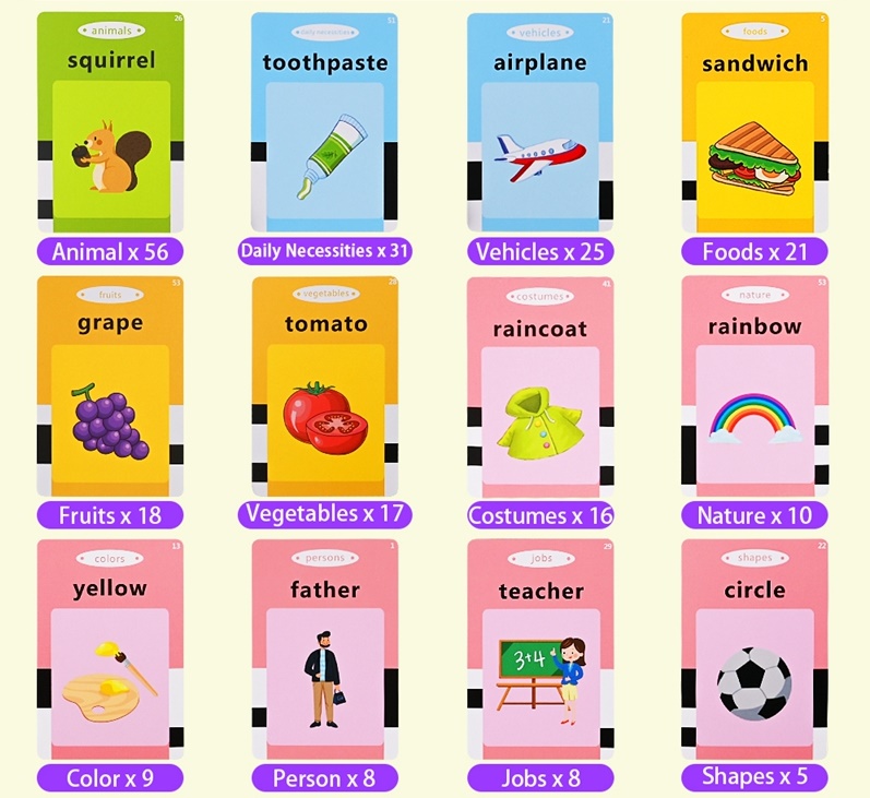 ✅ Кожна картка містить два попередньо завантажених слова, по одному на кожній сторінці, і відповідний малюнок, щоб зрозуміти їх значення. Це стимулює як зір, так і слух дитини, тому він, безперечно, адаптується до найефективнішого способу навчання для кожної дитини.
