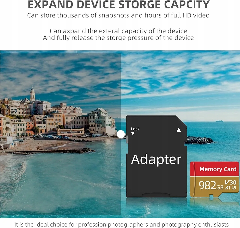 [Дивовижна ємність] Ця карта пам’яті пропонує вражаючу ємність у 982 ГБ, що більш ніж достатньо для зберігання різноманітних даних. Незалежно від того, чи це мелодійна музика, багаті навчальні матеріали, цінні фотографії, яскраві відео чи креативні зображення, ним можна легко керувати, щоб задовольнити різноманітні потреби під час щоденного навчання, ділових поїздок і подорожніх документів.