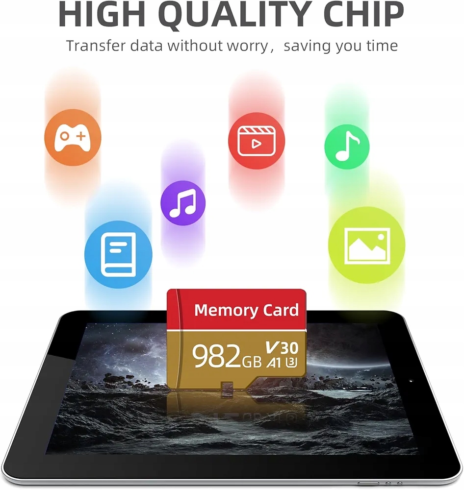 Широка сумісність] Карта пам’яті mini TF на 982 ГБ із чудовою сумісністю стане ідеальним компаньйоном для таких пристроїв, як фотоапарати, планшети, монітори, ноутбуки, настільні комп’ютери, дрони, телевізори високої чіткості, плеєри та портативні ігрові консолі, задовольняючи різноманітні потреби щодо зберігання даних.